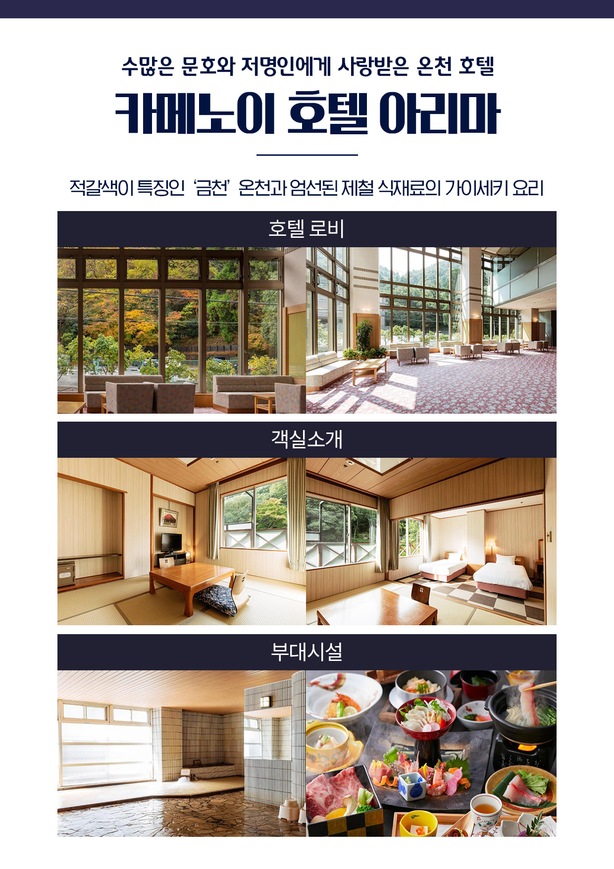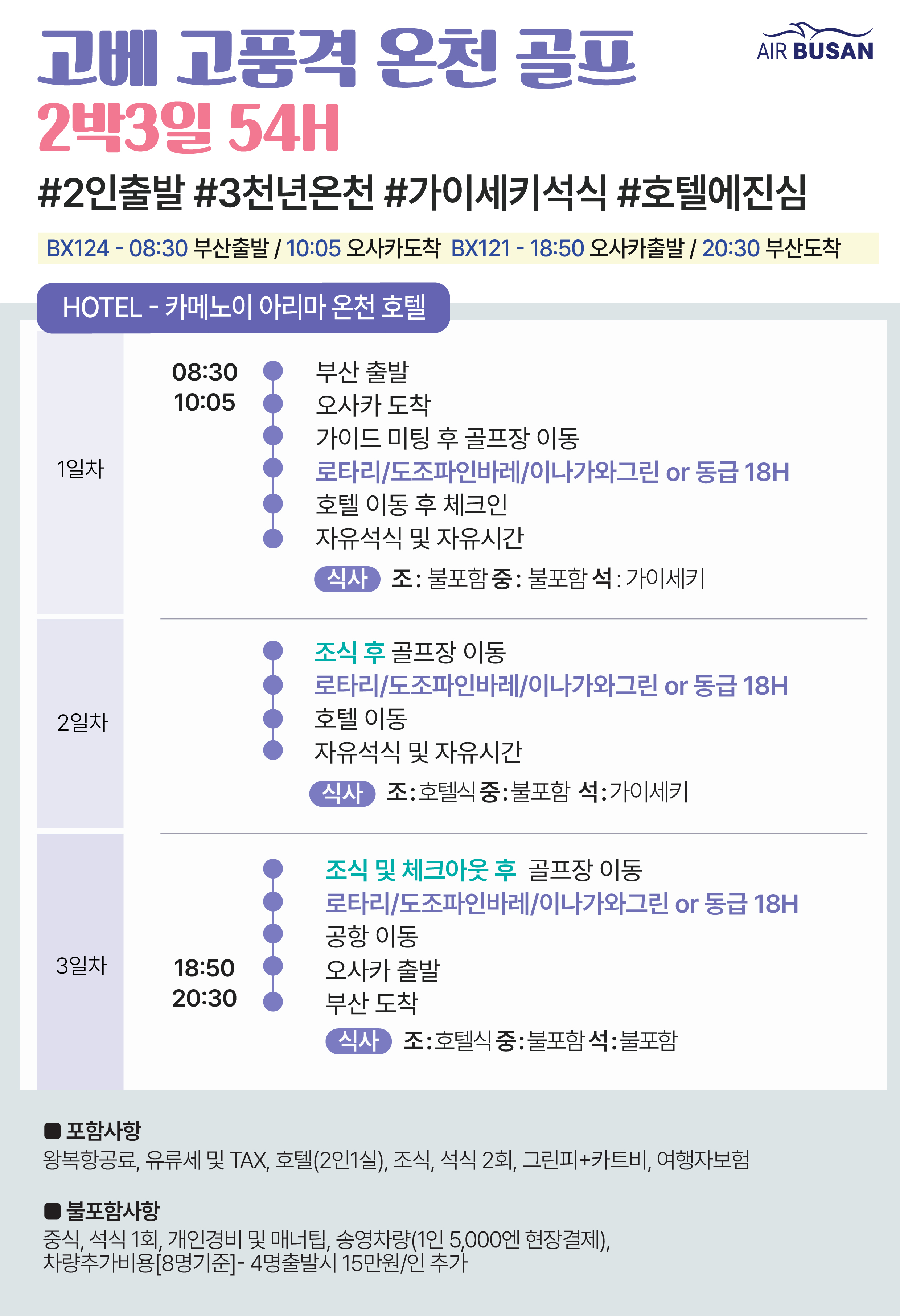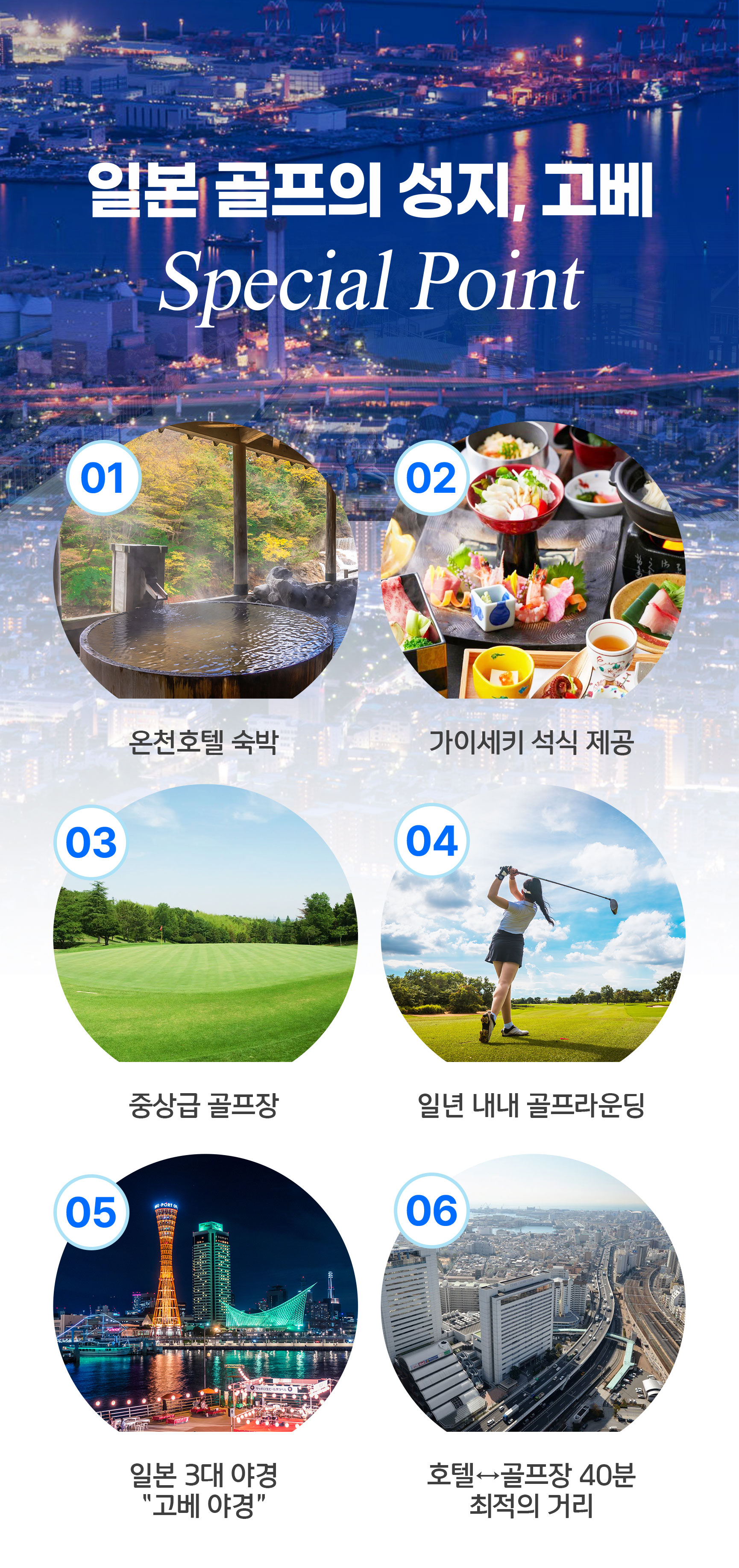📍 핵심포인트 1️⃣ 아리마 천연온천 호텔 숙박-라운드 후 즐기는 온천욕 2️⃣ 신선한 제철 식재료의 가이세키 석식 제공 3️⃣ 엄선된 중상급 골프장 4️⃣ 일년 내내 라운딩 가능 5️⃣ 일본 3대 야경 "고베야경" 6️⃣ 호텔-골프장 최적의 이동거리