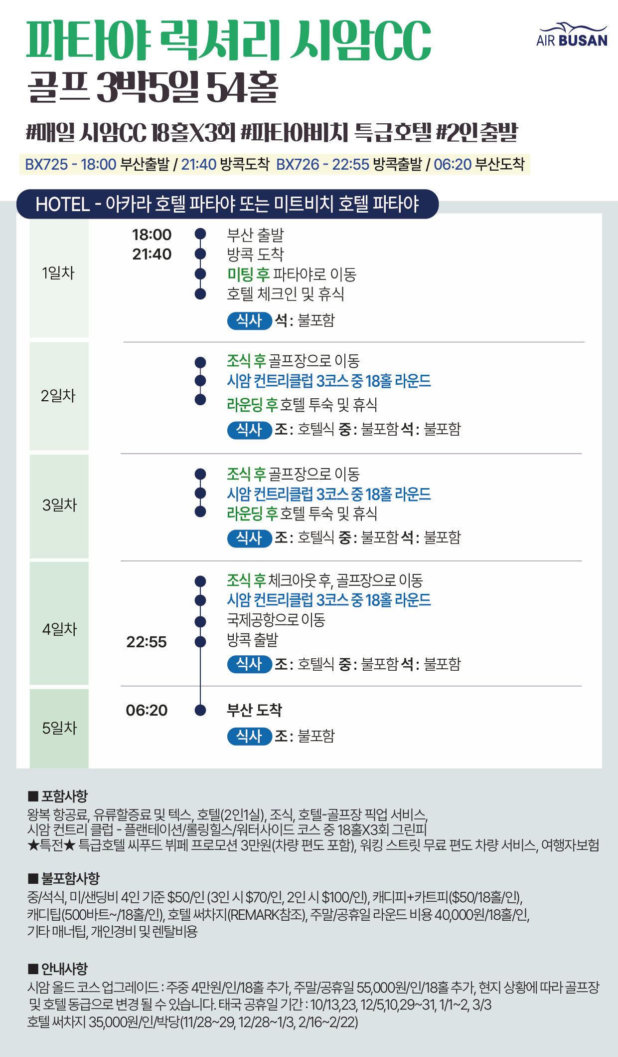 [부산출발] 💛시암 컨트리 클럽 완전정복💛 파타야 럭셔리 골프 5일 54H⛳