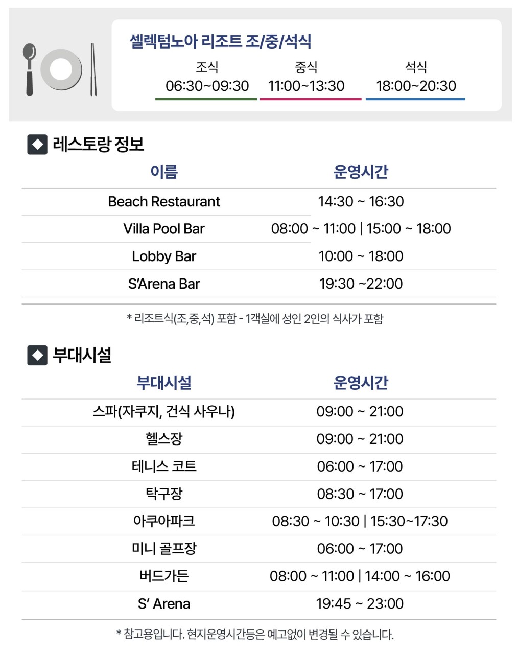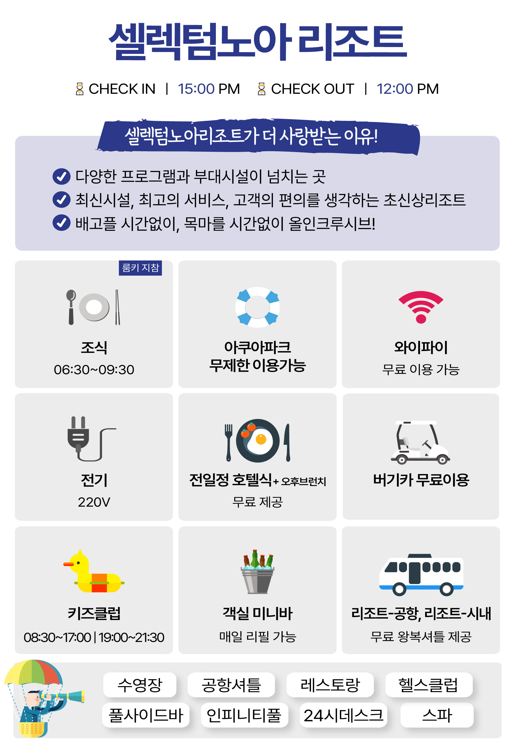 셀렉텀노아 올인크루시브(ALL-INCLUSIVE) ▶전일정 식사와 드링크까지 올-포함! ▶식사시간 이외 간단한 핑거푸드와 과일,음료 주류를 즐길 수 있는 스낵바 ▶로비바, 빌라풀바, S’Arena에서 즐기는 무.제.한 음료와 맥주, 와인, 칵테일! ▶매일 한번씩 리필되는 객실내 무료 미니바 ▶인피니티풀을 포함한 3개의 수영장과 6개의 워터슬라이드가 있는 워터파크 무.제.한 입장! ▶골프, 테니스, 자전거 등 다양한 액티비티 공간 + 요리, 스포츠, 웰니스 등 특별한 체험 클래스까지 ▶실내,야외 넓은 키즈클럽과 베이비시터 서비스, 무료 키즈 프로그램까지 제공! ▶시내 왕복 셔틀버스 운영
