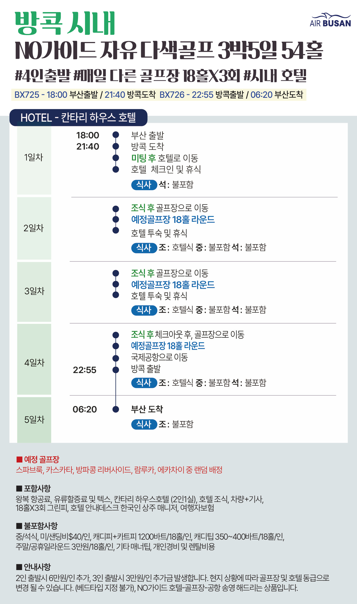 ✅ 2인이상 출발 가능❤️ ✅ NO가이드NO쇼핑 프라이빗한 골프여행❤️ ✅ N번째 방콕 방문자를 위한 합리적인 가격의 방콕 골프 패키지💁🏻 ✅ 다양한 즐길거리 가득한 방콕 호텔 숙박🏨 ✅ 방콕 근교 매일 다른 골프장 라운딩⛳ ✅ 에어부산 넓은 좌석 + 23KG 골프 수화물 추가 서비스✈️