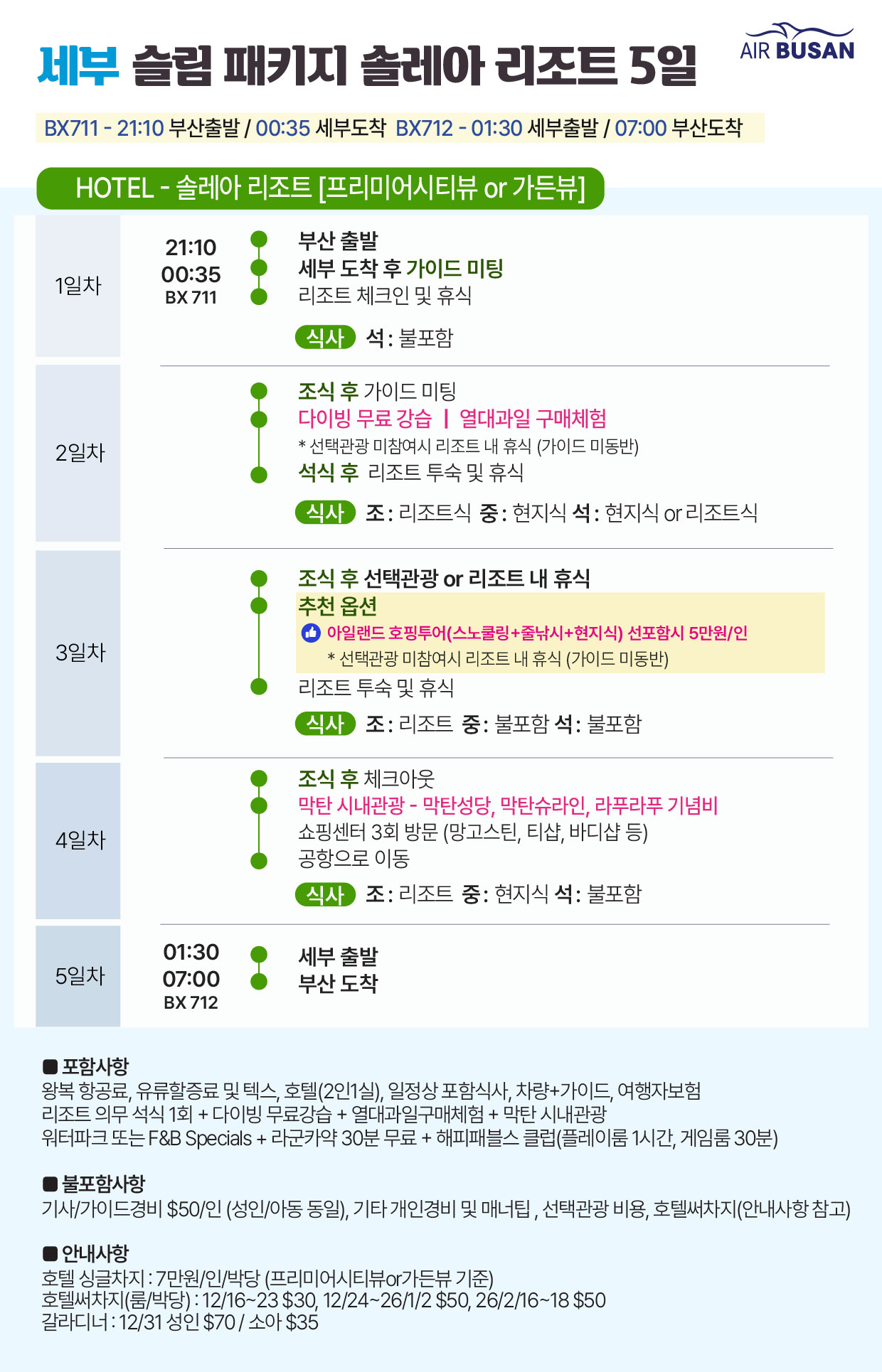✨핵심 포인트✨ 🏨 가성비 좋은 4성급 솔레아리조트 숙박 + 전일정 조식 🚣 라군카약 30분 무료 이용 🍽️ 리조트 석식 1회 제공 🥤 워터파크/풀바 음료 서비스 🤿 다이빙 무료 강습 포함 (이론 + 수영장 실습) 🏙️ 막탄 시내관광 + 열대과일 가게 방문 포함 💙 편안한 숙박과 다양한 부대혜택으로 알차게 즐기는 세부 힐링 여행 ✨담당자 추천 PICK✨ 💙 세부 여행이라면 놓칠 수 없는 필수 선택관광! 🛥️ 호핑투어 눈부신 세부 바다를 가장 특별하게 만나는 베스트 코스! 에메랄드빛 바다 위에서 잊지 못할 추억을 만들어보세요 🐠☀️ 💆 전신마사지 여행의 피로를 부드럽게 풀어주는 힐링 필수 코스! 하루의 마무리를 더 편안하고 완벽하게 채워드립니다 🌿✨ 호핑투어로 짜릿한 바다를 즐기고, 전신마사지로 힐링까지 완성하세요 ✈️🌴