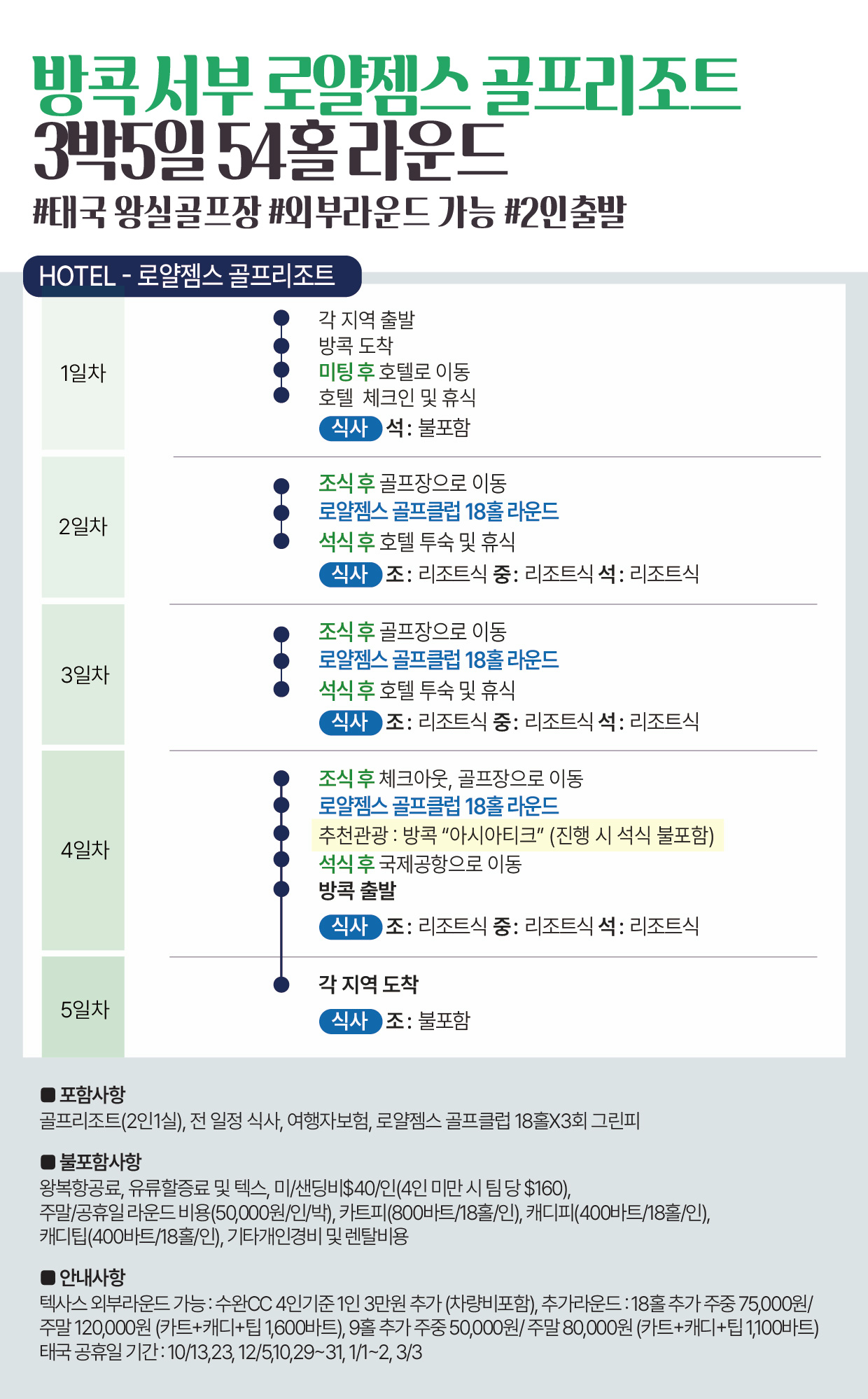 • REMARK ■ 태국 공휴일 기간 : 4/6,13~15,5/1,4,31,6/1,3,7/28~30,8/12,10/13,23 ■ 골프장 사정에 따라 라운드는 조인 진행 될 수 있습니다. ■ 에어부산 무료수화물 규정 : 위탁/23KG 기내/10KG ■ 태국입국시 담배는 1인 1보루, 술은 1인 1병(1ℓ), 전자담배 금지 입니다. ■ 현지 상황에 따라 골프장 및 호텔 동급으로 변경 될 수 있습니다. ■ 여권 만료기간이 6개월 이상 남아있는지, 여권종류 & 훼손 등 사전 체크 꼭 부탁 드립니다.