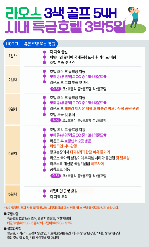 🌟라오스 3색 골프 체크 포인트😍 ✅ 4인 출발 확정, 2인 조인 조건으로 예약 가능❤️ ✅ 시내 중심지 5성 호텔, 골프 전문 가이드 동행💁🏻 ✅ 라오스 시내 근교 매일다른 골프장 18홀 라운드🏌🏻‍♂️ ✅ 라오스 필수 코스 핫 플레이스 투어🔥