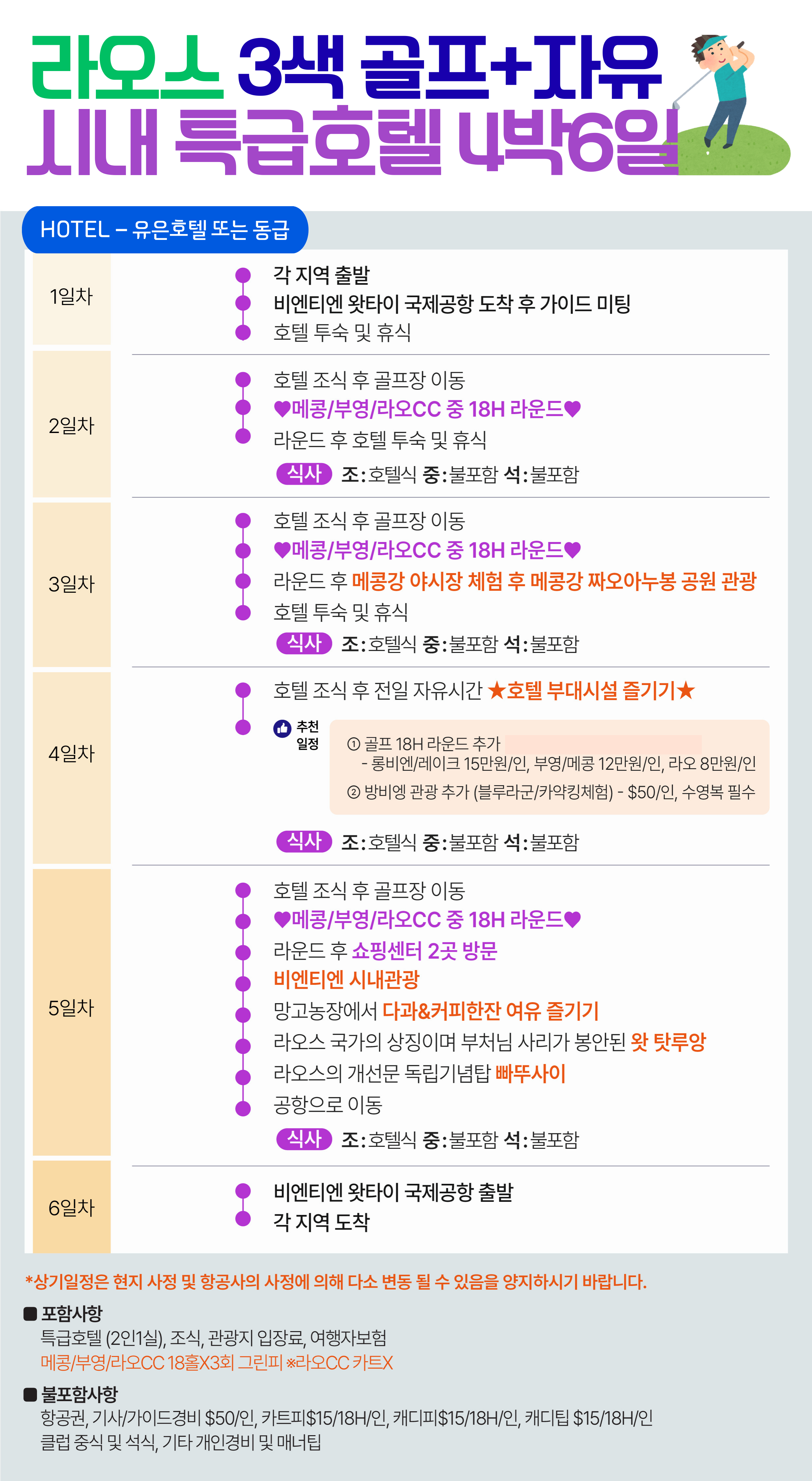 🌟라오스 3색 골프 체크 포인트😍 ✅ 4인 출발 확정, 2인 조인 조건으로 예약 가능❤️ ✅ 시내 중심지 5성 호텔, 골프 전문 가이드 동행💁🏻 ✅ 라오스 시내 근교 매일다른 골프장 18홀 라운드🏌🏻‍♂️ ✅ 라오스 필수 코스 핫 플레이스 투어🔥 ✅ 1일자유일정