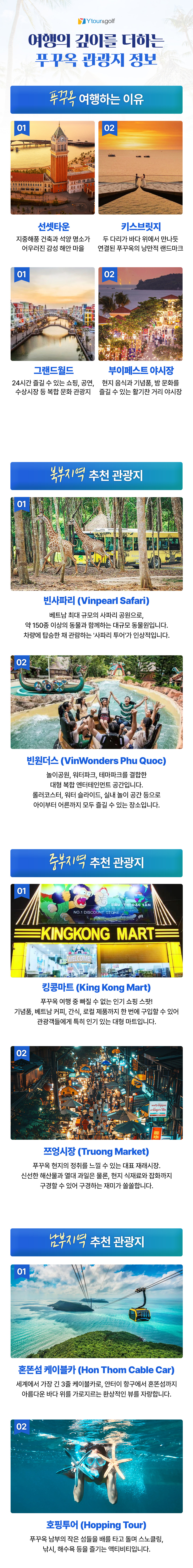 👨‍👩‍👧‍👦 출발 인원 4명 이상 출발 확정 🏨 숙박 푸꾸옥 인기 리조트에서 즐기는 여유로운 휴식 4성 무엉탄 럭셔리 리조트 또는 동급 / 5성 베스트웨스턴 리조트 또는 동급 쾌적한 객실과 다양한 부대시설로 편안한 휴양을 즐길 수 있습니다. 🚡 관광 세계 최장 혼텀섬 해상 케이블카 탑승 썬월드 자유일정 (아쿠아토피아·놀이기구 무료 이용) 빈펄 사파리 & 빈원더스 그랜드월드 포함 🍽️ 식사 전 일정 특식제공 (4박6일은 5일차 식사제외) TV 속(독박투어) 3대 맛집 방문- 빈산 씨푸드, 분짜 하노이, 보토콴 BBQ