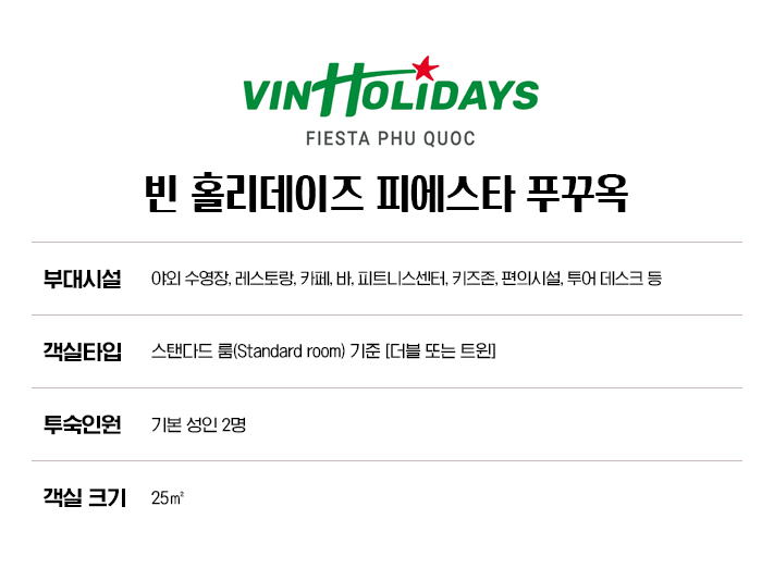 📍 입국 패스트트랙 + 공항 픽업 왕복 * 공항 대기 없이 '빠른 입국 수속 + 편한 공항 이동' 🎢 추가 혜택 * VinWonders 또는 Vinpearl Safari 1회 입장 포함 * 얼리 체크인 10:00 또는 레이트 체크아웃 18:00 제공 🏨 VinHolidays Fiesta Phu Quoc 장점 요약 * 북부 핵심 스팟 접근엔 최고의 리조트 * 대규모의 수영장이 있어, 감성적인 인생사진 맛집! * 빈펄 단지 내 호텔로 이동거리 '깔끔한 시설 + 안정적인 관리' * 가성비 좋은 금액에 조식 포함 숙박 * 테마파크 또는 사파리 입장권 포함으로 여행 비용 절약까지! * 얼리체크인 / 레이트체크아웃 혜택으로 일정 여유롭게 이용 가능