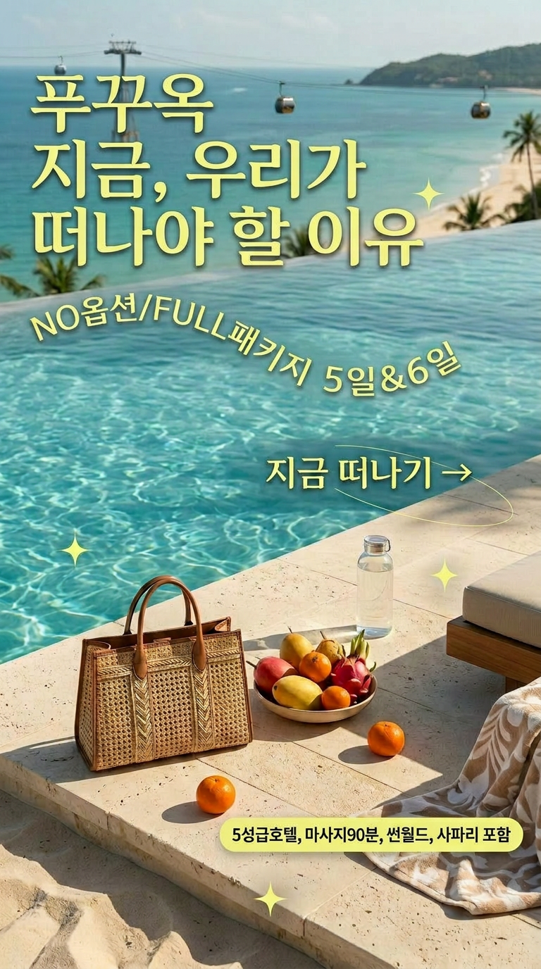 🏨 숙박 푸꾸옥 대표 5성급 호텔에서 품격있게 휴식 >> 레디슨 블루, 베스트웨스턴, 노보텔 또는 동급 넓은 객실과 최고급 부대시설 제공 🚡 관광 세계 최장 혼똔섬 케이블카 탑승 하늘 위에서 즐기는 환상적인 바다 전망과 섬 풍경 썬월드 내 자유일정포함 [아쿠아토피아,놀이기구 무료이용] 빈펄사파리 & 빈그랜드월드 포함 🍽️ 식사 전 일정 현지 특식 + 호텔 조식 포함 추가 비용 없는 노옵션 패키지로 걱정 없는 여행 👨‍👩‍👧‍👦 출발 인원 4명 기준 출발 확정