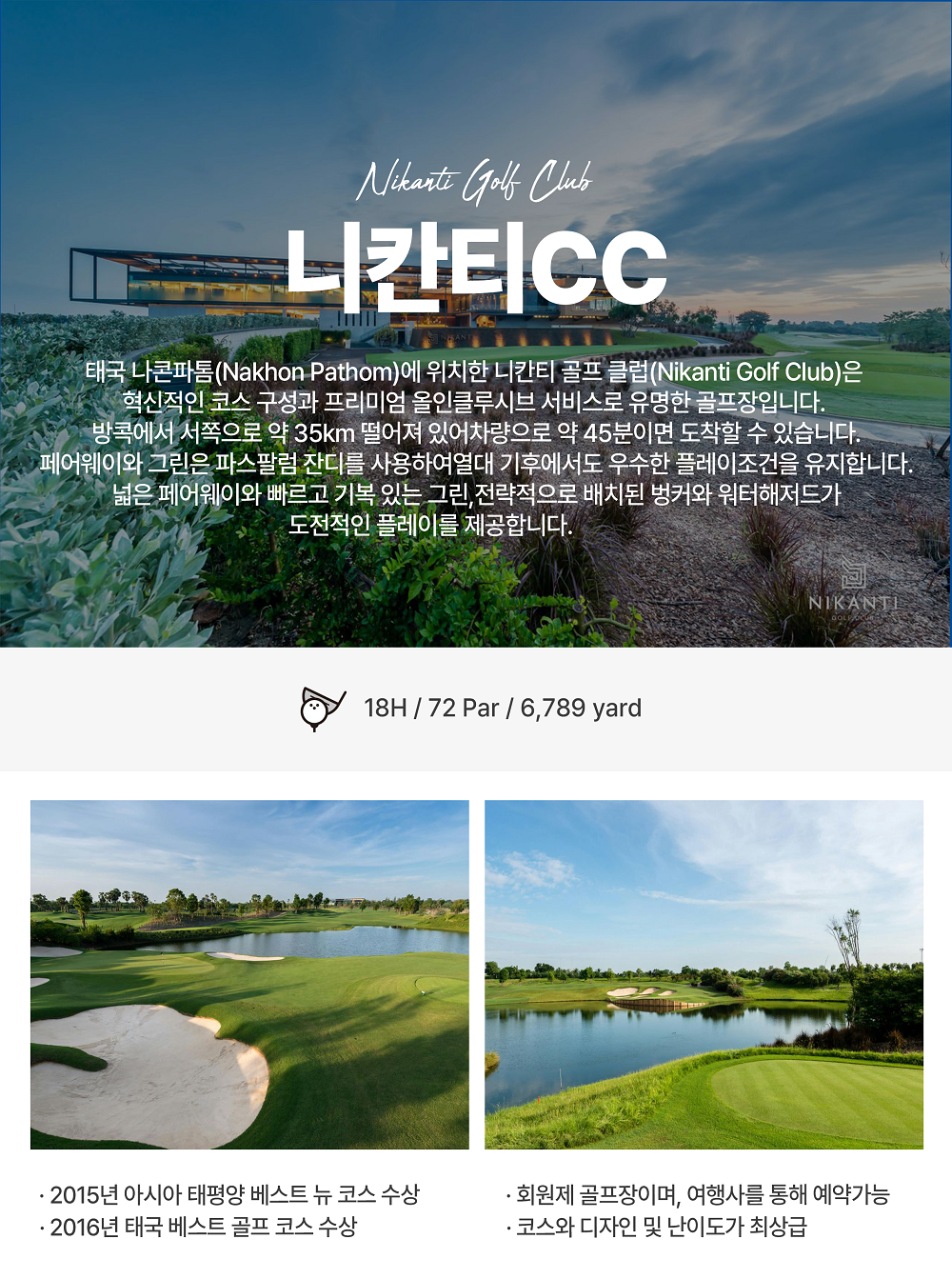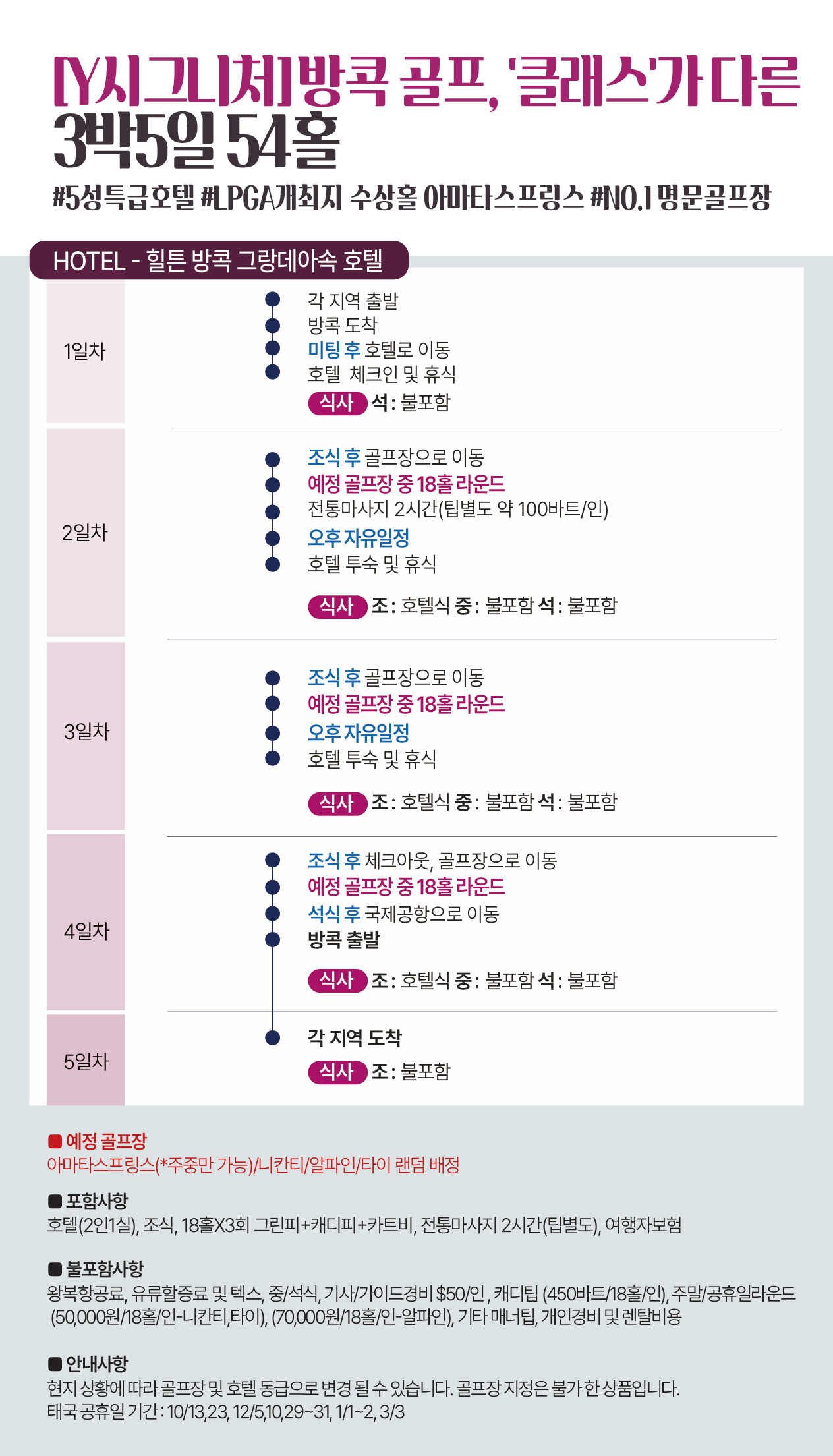 🌴 태국 3색 골프 투어 – 아마타 스프링스 · 알파인 · 니칸티 + 힐튼 그랑데 아속 숙박 태국 방콕의 대표 명문 골프장 아마타 스프링스, 알파인, 니칸티에서 각각 18홀 라운딩을 즐기는 프리미엄 골프 투어입니다. 세계적인 대회가 열린 챔피언십 코스와 독특한 디자인의 골프장에서 색다른 골프 경험을 누려보세요. 숙박은 방콕 중심, BTS 아속역 인근의 5성급 호텔 힐튼 그랑데 아속으로, 라운딩 후에도 쾌적하고 품격 있는 휴식을 제공합니다. 쇼핑몰, 맛집, 마사지샵 등이 가까워 골프+도심 관광 모두 만족할 수 있는 최적의 패키지입니다. ✔ 패키지 포인트 🏌️‍♂️ 아마타 스프링스: 세계 유일 섬그린 파3 / PGA, LPGA 개최지 🏌️‍♂️ 알파인: 타이거 우즈가 참가한 대회 코스 / 도전적인 설계 🏌️‍♂️ 니칸티: 6-6-6 독특한 코스 / 식사 포함된 올인클루시브 🏨 숙소: 힐튼 그랑데 아속 방콕 / 도심 중심 프리미엄 호텔 🚘 맞춤형 편의 서비스 전용 차량 이동으로 골프장-호텔 간 이동 걱정 없이 편하게 한국어 가이드 – 처음 가는 골퍼도 안심 골프 외 여유시간엔 방콕 관광, 쇼핑, 맛집 탐방까지 가능!