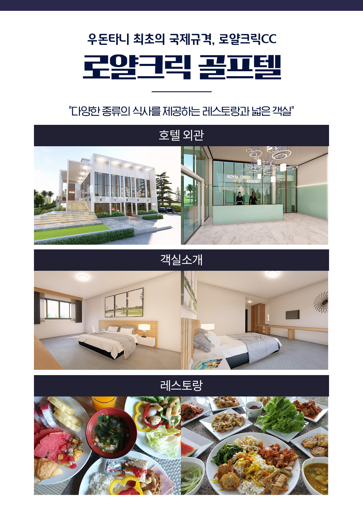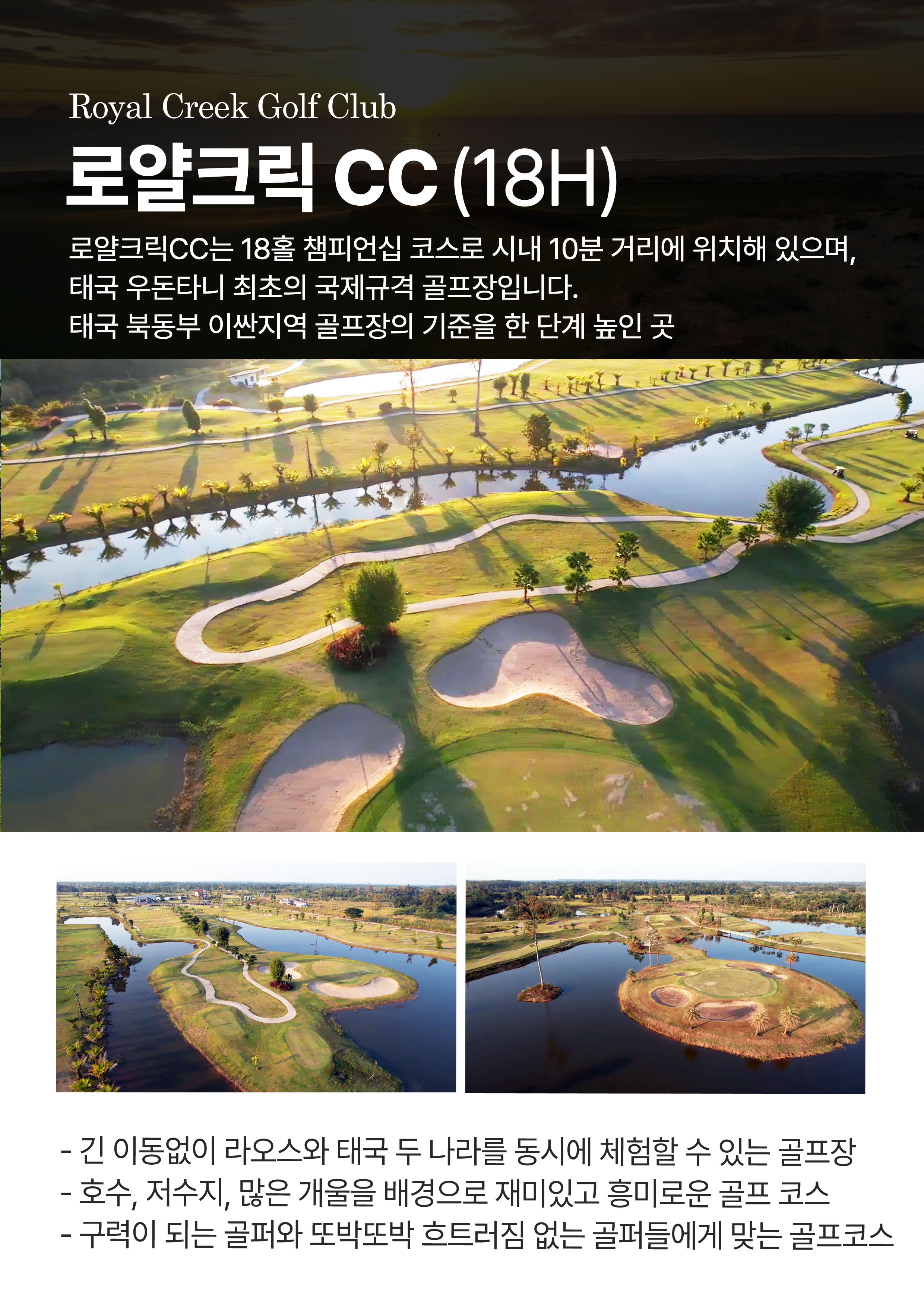 ⛳로얄크릭 무재한 골프 패키지의 매력은? ✅태국 우돈타니 고원 지역 위치한 명문 골프장 ✅36홀? 54홀 치셔도 됩니다 진짜 무제한 골프 패키지 ✅롱비엔/우본라타나 등 명문 골프장 외부 라운딩 가능 ✅2023년 리모델링으로 깔끔한 숙소 컨디션 ✅라오스-태국 국경 VIP 패스 편안한 이동 ✅한식 맛집 전 일정 맛있는 식사 ALL포함 ✅한국인 상주 직원 친절한 서비스