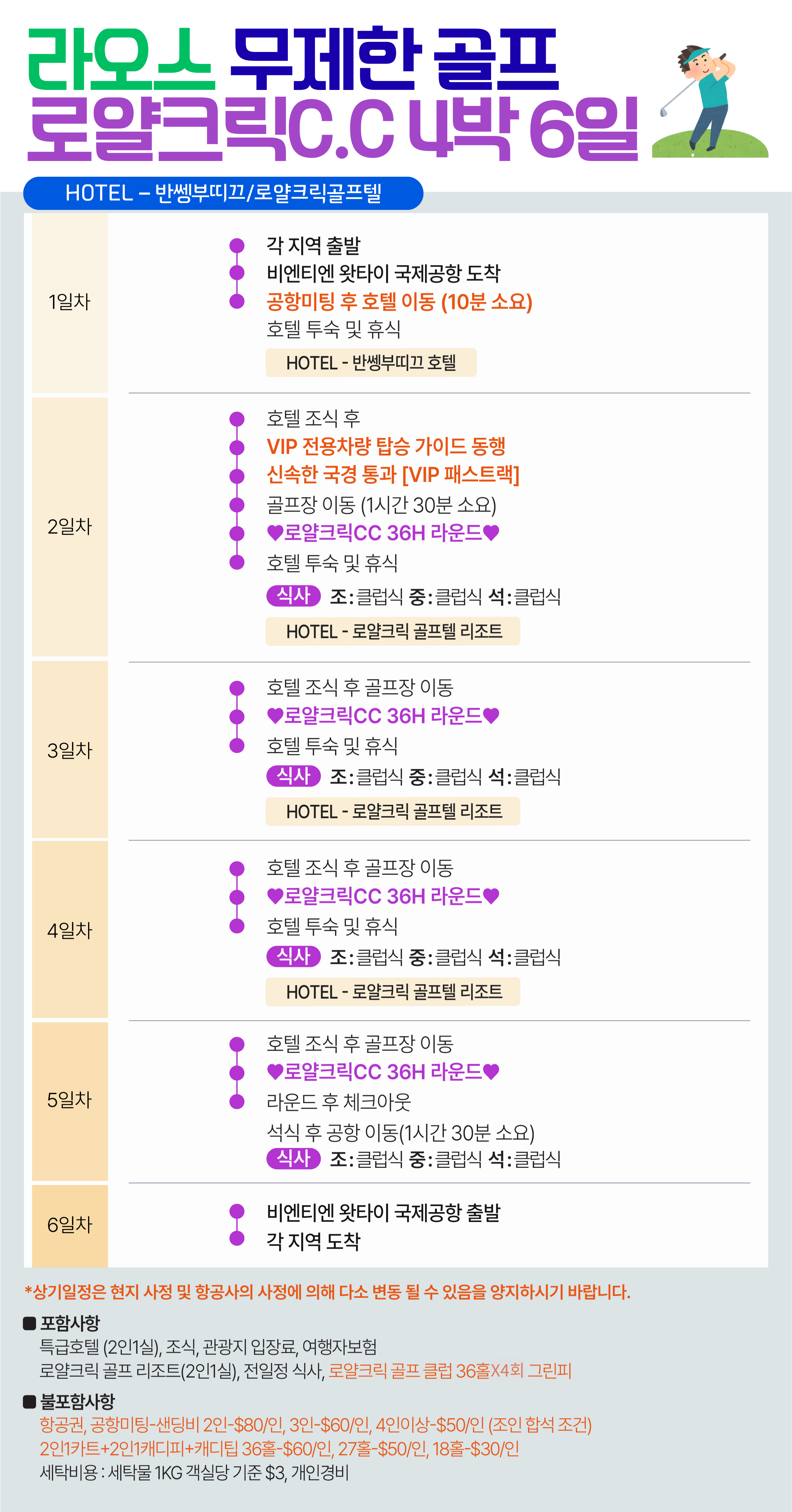 • REMARK ■ 4인 미만도 예약 가능하며 기본적으로 4인 이하는 현지 조인 베이스입니다. ■ 에어부산 무료수화물 규정 : 위탁/23KG 기내/10KG ■ 골프장의 운영사정에 따라 확정된 티옵시간은 변동될 수 있습니다. ■ 여권 만료기간이 6개월 이상 남아있는지, 여권종류 & 훼손 등 사전 체크 꼭 부탁드립니다. ■ 공항미팅안내 : 공항도착후 가방을 찾으신후 출구에서 공항 가이드 와 미팅 출구는 한곳 밖에 없습니다. ■ 공항미팅 후 가이드와 동반 이동 10분 반셍부띠크호텔 체크인 후 휴식/자유시간 ■ 라운딩 복장으로 06:30분 부터 조식 후 07:00 이후 국경지역으로 이동. 라오스국경에서는 내리지 않고 통과 후 태국 국경도착후 여권들고 VIP통과
