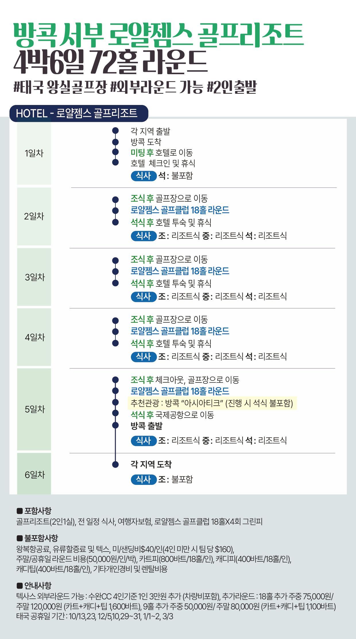 • REMARK ■ 태국 공휴일 기간 : 4/6,13~15,5/1,4,31,6/1,3,7/28~30,8/12,10/13,23 ■ 골프장 사정에 따라 라운드는 조인 진행 될 수 있습니다. ■ 에어부산 무료수화물 규정 : 위탁/23KG 기내/10KG ■ 태국입국시 담배는 1인 1보루, 술은 1인 1병(1ℓ), 전자담배 금지 입니다. ■ 현지 상황에 따라 골프장 및 호텔 동급으로 변경 될 수 있습니다. ■ 여권 만료기간이 6개월 이상 남아있는지, 여권종류 & 훼손 등 사전 체크 꼭 부탁 드립니다.