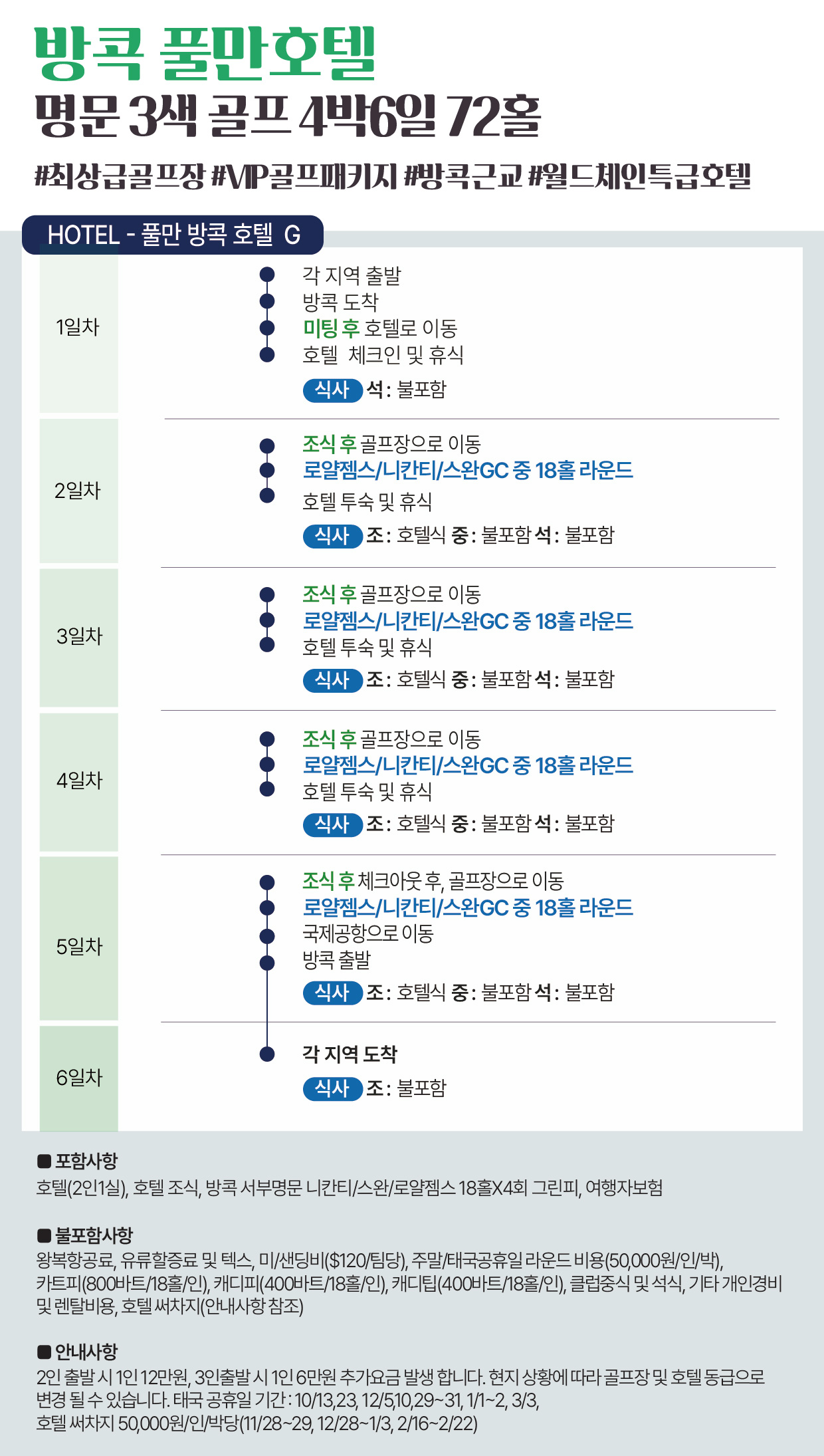 • REMARK ■ 예정 골프장 : 니칸티GC, 수완GC, 로얄젬스GC 중 18홀X3회 (1인1카트/1인1캐디) ■ 태국 공휴일 기간 : 5/1,4,31,6/1,3,7/28~30,8/12,10/13,23 ■ 2인 출발 시 1인 12만원, 3인출발 시 1인 6만원 추가요금 발생 합니다. ■ 현지 상황에 따라 골프장 및 호텔 동급으로 변경 될 수 있습니다. ■ 골프장 사정에 따라 라운드는 조인 진행 될 수 있습니다. ■ 태국입국시 담배는 1인 1보루, 술은 1인 1병(1ℓ), 전자담배 금지 입니다. ■ 여권 만료기간이 6개월 이상 남아있는지, 여권종류 & 훼손 등 사전 체크 꼭 부탁 드립니다.