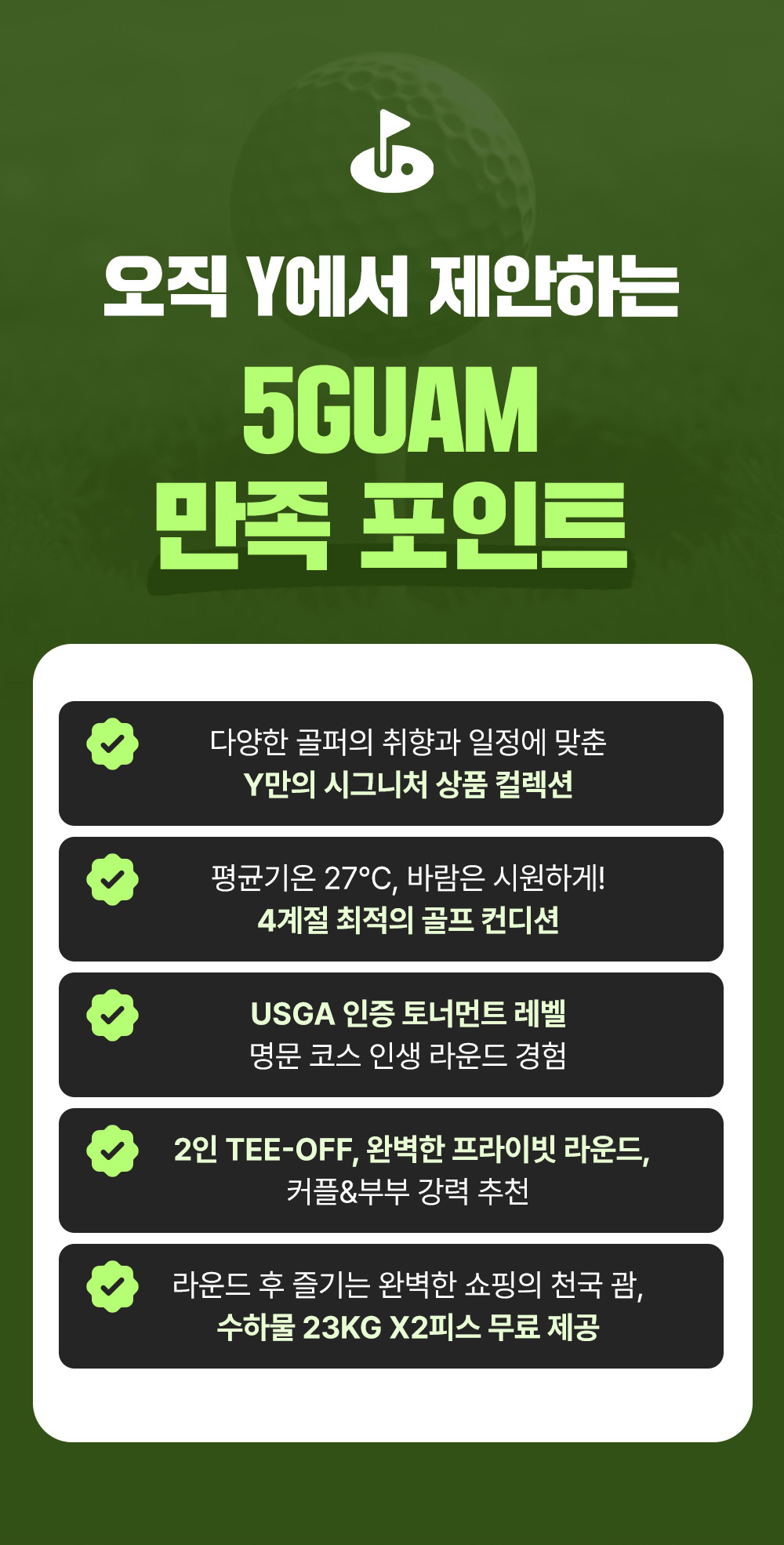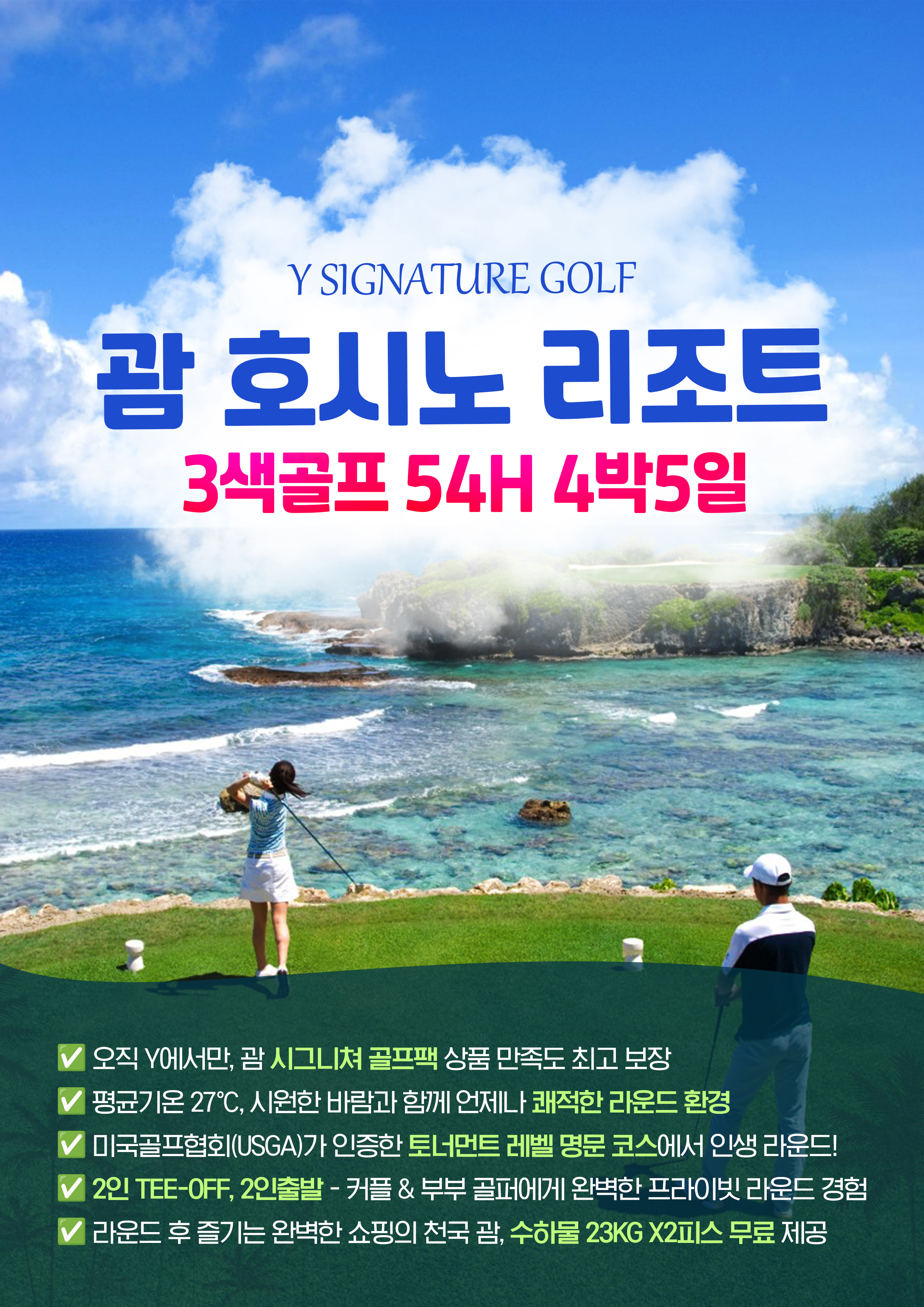 💎Y 시그니처 골프 패키지 ✅ 오직 Y에서만, 괌 시그니쳐 골프팩 상품 만족도 최고 보장💁‍♂️ ✅ 평균기온 27℃, 시원한 바람과 함께 언제나 쾌적한 라운드 환경🌴 ✅ 미국골프협회(USGA)가 인증한 토너먼트 레벨 명문 코스에서 인생 라운드!⛳ ✅ 2인 TEE-OFF, 2인출발 - 커플 & 부부 골퍼에게 완벽한 프라이빗 라운드 경험💕 ✅ 라운드 후 즐기는 완벽한 쇼핑의 천국 괌, 수하물 23KG X2피스 무료 제공✈️