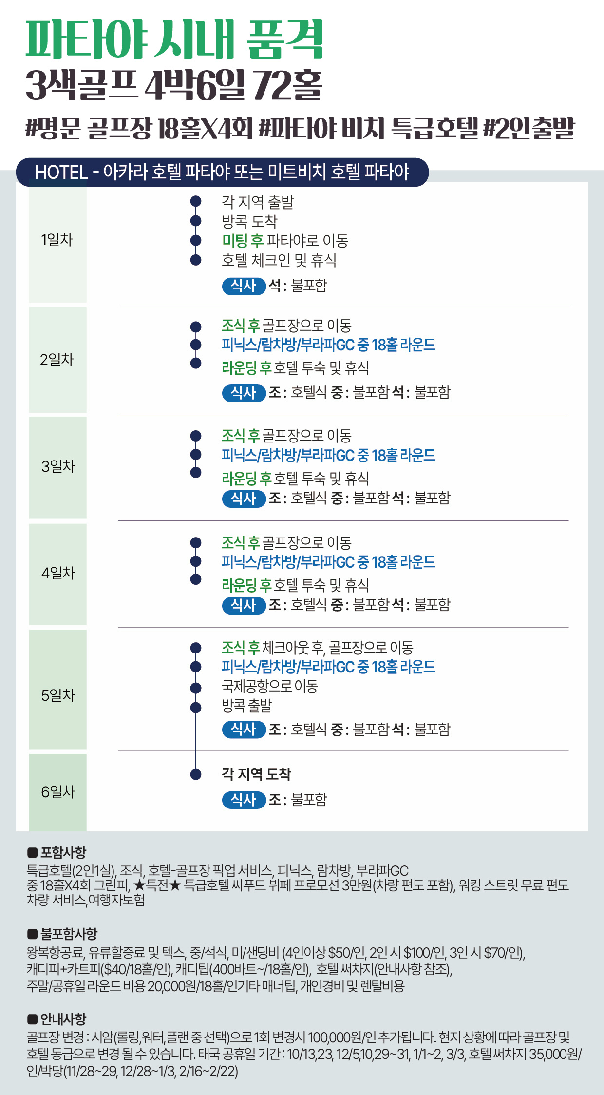 • ■ 골프장 변경 : 시암(롤링,워터,플랜 중 선택)으로 1회 변경시 100,000원/인 추가됩니다. ■ 현지 상황에 따라 골프장 및 호텔 동급으로 변경 될 수 있습니다. ■ 태국 공휴일 기간 : 10/13,23, 12/5,10,29~31, 1/1~2, 3/3 ■ 골프장 사정에 따라 라운드는 조인 진행 될 수 있습니다. ■ 에어부산 무료수화물 규정 : 위탁/23KG 기내/10KG ■ 태국입국시 담배는 1인 1보루, 술은 1인 1병(1ℓ), 전자담배 금지 입니다. ■ 여권 만료기간이 6개월 이상 남아있는지, 여권종류 & 훼손 등 사전 체크 꼭 부탁 드립니다.