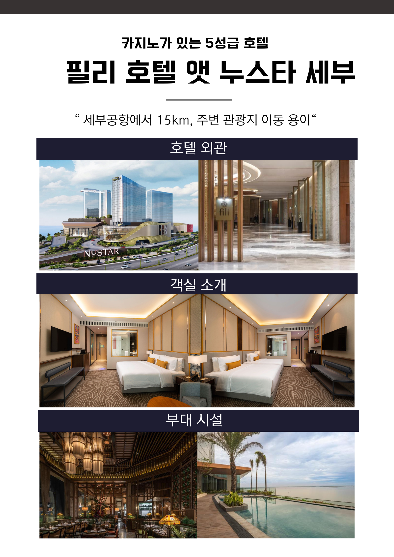 ✅ 세부 최대 규모 카지노 보유✨ 5성급 누스타 필리 호텔 - 디럭스룸(2인1실) 숙박 ✅ 클럽 필리피노CC + 알타비스타CC + 릴로안CC 중 18홀X3회 라운딩 ✅ 마음대로 자유롭게! 자유일정 1일 ✅ 노쇼핑 노옵션