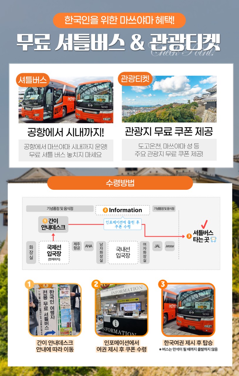 💙 프리미엄 힐링! 마츠야마 LEPO 차하루 + 도고 차하루 2박3일 💙 ★공항↔호텔 무료셔틀 포함 에어텔★ ━━━━━━━━━━━━━━━━━━━ ⭐ 프리미엄 호텔 구성 ⭐ 🏨 시내 LEPO 차하루 1박 + ♨️ 도고 차하루 온천호텔 1박 ✨ 시내 + 온천을 모두 즐기는 완벽한 조합 🍽️ 온천호텔 석식 & 조식 포함 / 시내호텔 조식 포함 ━━━━━━━━━━━━━━━━━━━ 📌 호텔 핵심 포인트 📍 오카이도 상점가 도보 1분 초중심 위치 ♨️ 도고 온천 지역 숙박으로 진짜 온천 힐링 🍱 온천호텔 가이세키 석식 포함 (프리미엄 식사) 🛍️ 쇼핑·카페·관광 모두 도보 이동 가능 ━━━━━━━━━━━━━━━━━━━ ✅ 상품 핵심 포인트 ✈️ 왕복 항공권 + 수하물 15kg 포함 🏨 프리미엄 호텔 2박 (2인1실) 🚌 공항 ↔ 호텔 무료 셔틀버스 이용 가능 🎫 관광지 무료 & 할인 쿠폰 제공 (1인 1매) ━━━━━━━━━━━━━━━━━━━ 🎯 이런 분들께 추천드려요 👍 온천 + 시내 여행을 모두 즐기고 싶은 분 👍 숙소 퀄리티를 중요하게 생각하는 분 👍 부모님과 함께하는 프리미엄 효도여행 👍 특별한 기념일 & 커플 여행을 계획하는 분 👍 짧지만 제대로 힐링하고 싶은 분 ━━━━━━━━━━━━━━━━━━━ 🎯 여행 핵심 매력 👉 시내 관광 + 온천 숙박을 한 번에 👉 프리미엄 호텔 + 가이세키 식사까지 완성 👉 자유시간과 힐링을 동시에 만족 ━━━━━━━━━━━━━━━━━━━ ✨ 한 줄 포인트 👉 “시내 감성 + 도고 온천 힐링을 모두 담은 프리미엄 마츠야마 여행” ━━━━━━━━━━━━━━━━━━━ #마츠야마여행 #도고온천 #차하루 #프리미엄여행 #온천여행 #에어텔 #힐링여행
