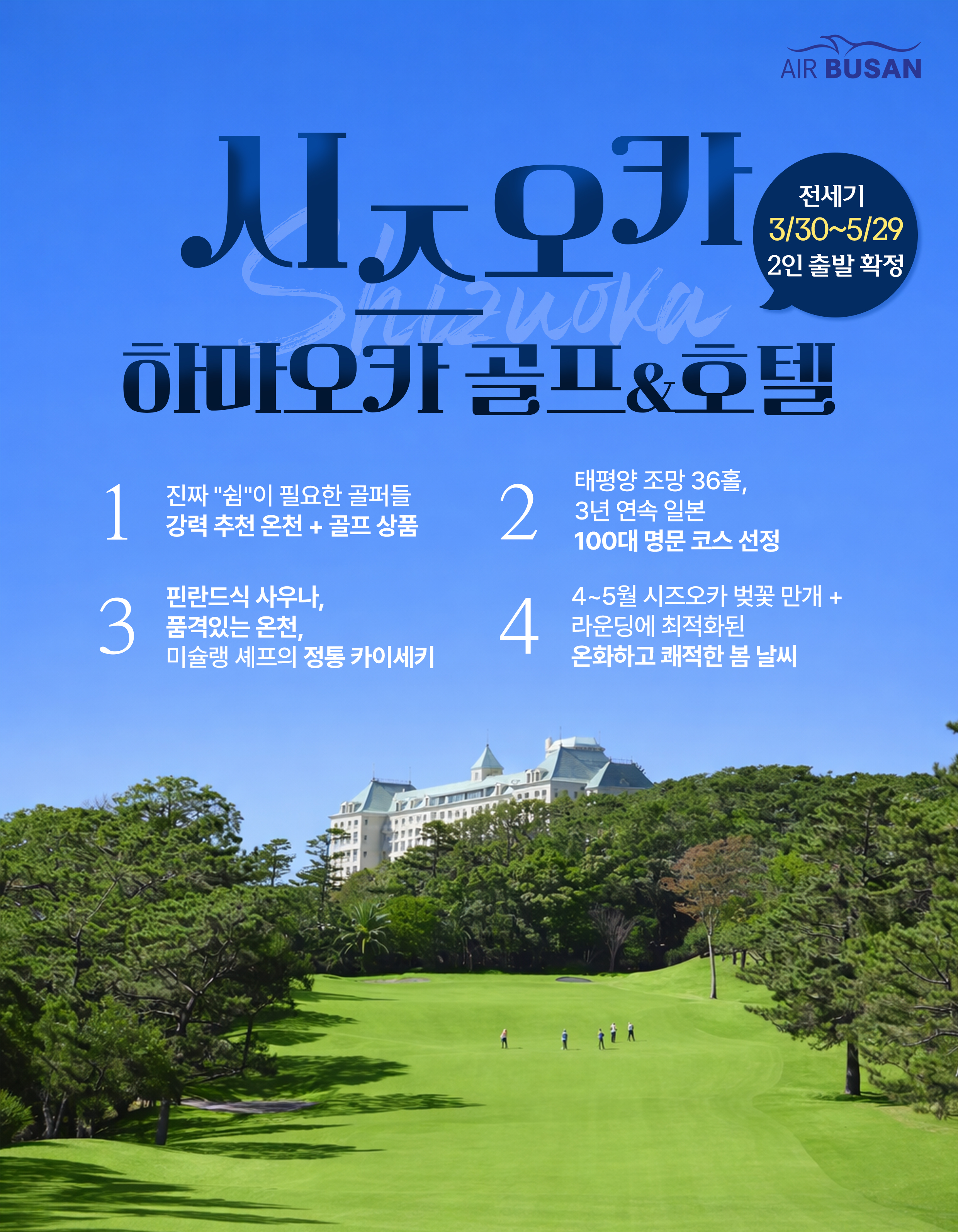 [부산직항] 💚월/수 출발 2박3일💚 🌊시즈오카 컨트리 하마오카 코스&호텔 36홀 라운드 #온천힐링 #오션뷰 코스 #36홀 규모 #일본 100대 명문