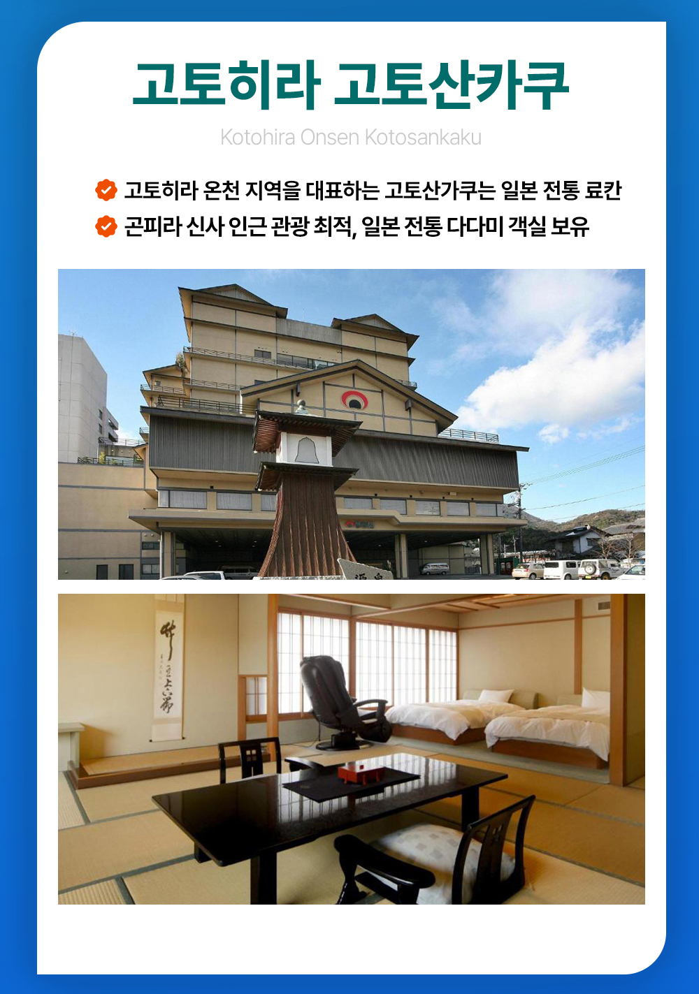 💙 자유여행에 온천 1박을 더한 구성 💙 ✈️ 부산 출발 다카마쓰 힐링 여행 🟣 상품 핵심 포인트 ✅ 부산 ↔ 다카마쓰 직항 이용 (약 80분) ✅ 다카마쓰 시내 중심 호텔 2박 (코코호텔 or 위베이스) ✅ 고토히라 온천 료칸 1박 (온천 힐링 숙박) ✅ 고토산카쿠 료칸 숙박으로 일본 감성 경험 ✅ 항공 + 호텔 + 여행자보험 포함 ✅ 전 일정 자유여행 (여유로운 일정 구성) ✅ 시내 관광 + 온천 여행을 한 번에 즐기는 일정 👍 이런 분들께 추천드려요 🏨 고토산카쿠 료칸 + 다카마쓰 시내호텔 ✔ 일본 여행에서 온천 료칸을 꼭 경험해보고 싶은 분 ✔ 시내 관광과 온천 힐링을 모두 즐기고 싶은 분 ✔ 부모님과 함께하는 효도여행을 고민하는 분 ✔ 감성적인 숙소에서 특별한 하루를 보내고 싶은 분 ✔ 자유여행이지만 숙소는 확실하게 챙기고 싶은 분 ✔ 친구·연인과 함께 색다른 여행을 원하는 분 ❌ 불포함사항 기타 개인경비 및 매너팁 호텔 조식 (시내호텔) 싱글 변경 시 추가비용 (별도 문의) 트윈 변경 시 추가비용 (날짜별 상이 / 별도 문의) 📍 꼭 확인해주세요 📍 호텔 미확보 상품입니다 → 예약 후 담당자가 가능 여부 및 확정 견적 안내드립니다 📍 예약 시점에 따라 → 요금 인상 또는 예약 불가될 수 있습니다 ✨ 한 줄 포인트 👉 “도심 여행 + 온천 료칸을 한 번에 즐기는 완벽한 구성” 🔖 해시태그 #부산직항다카마쓰 #다카마쓰에어텔 #다카마쓰온천료칸 #고토히라온천 #다카마쓰자유여행 #다카마쓰시내호텔 #효도여행추천 #다카마쓰3박4일