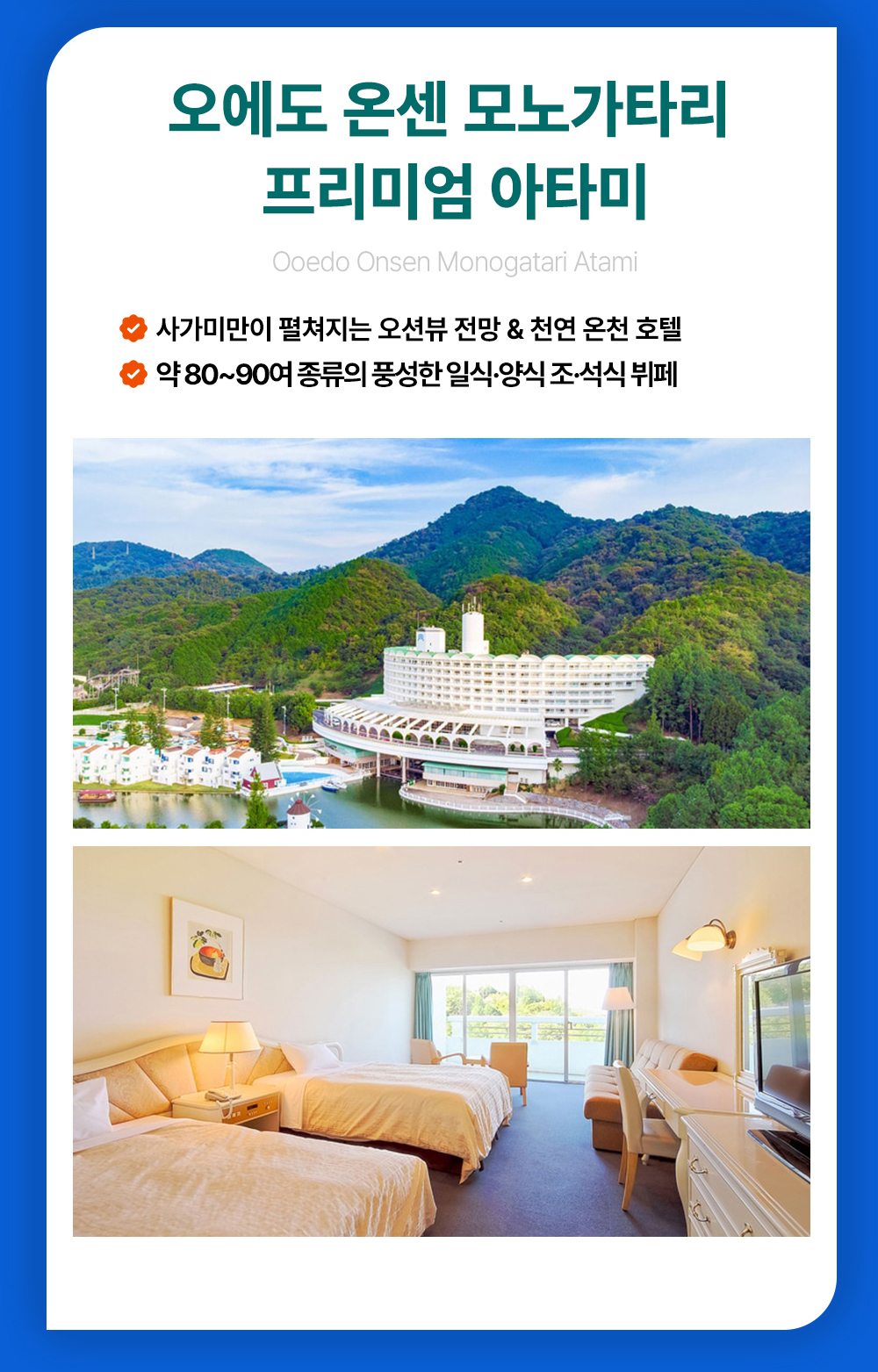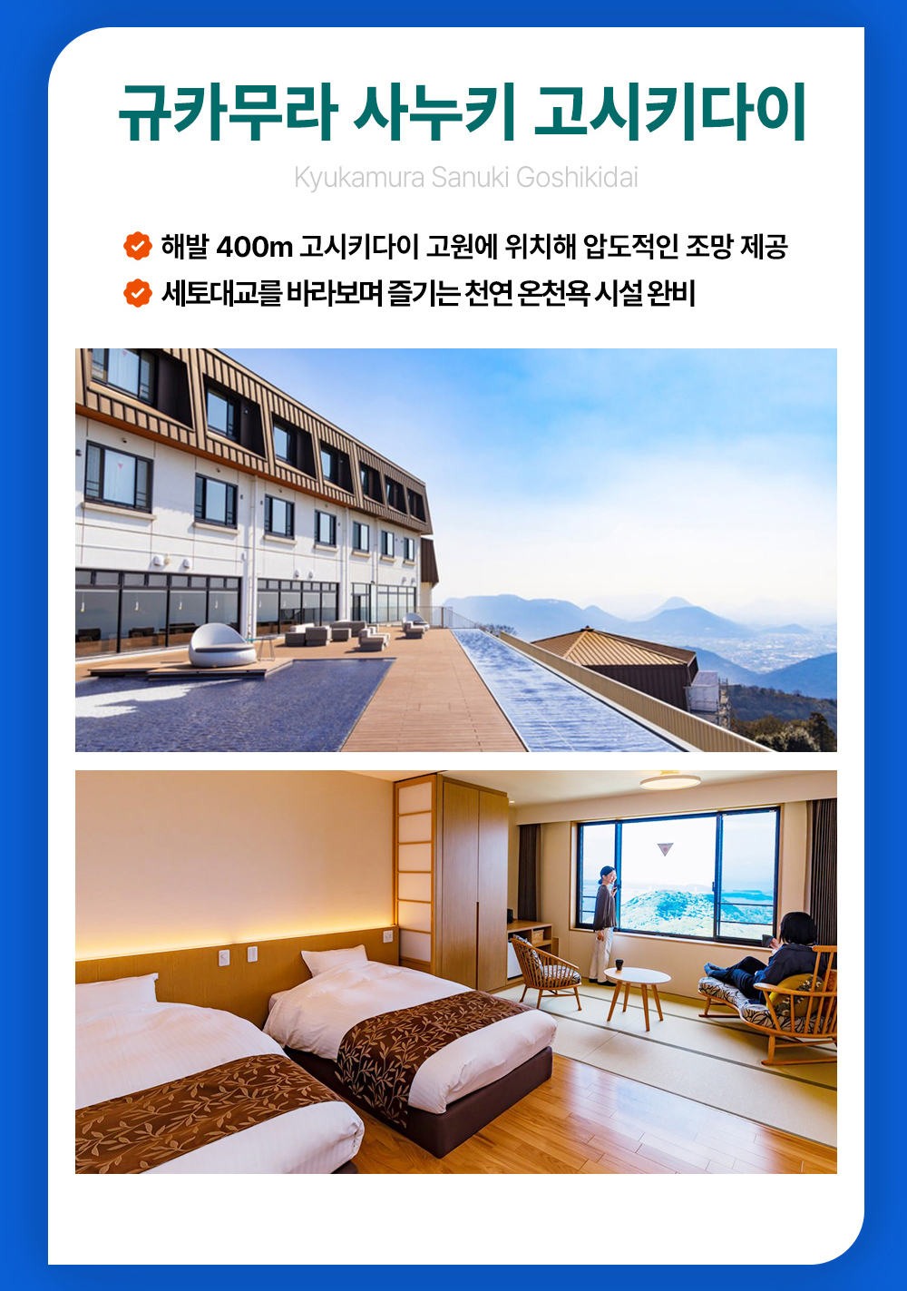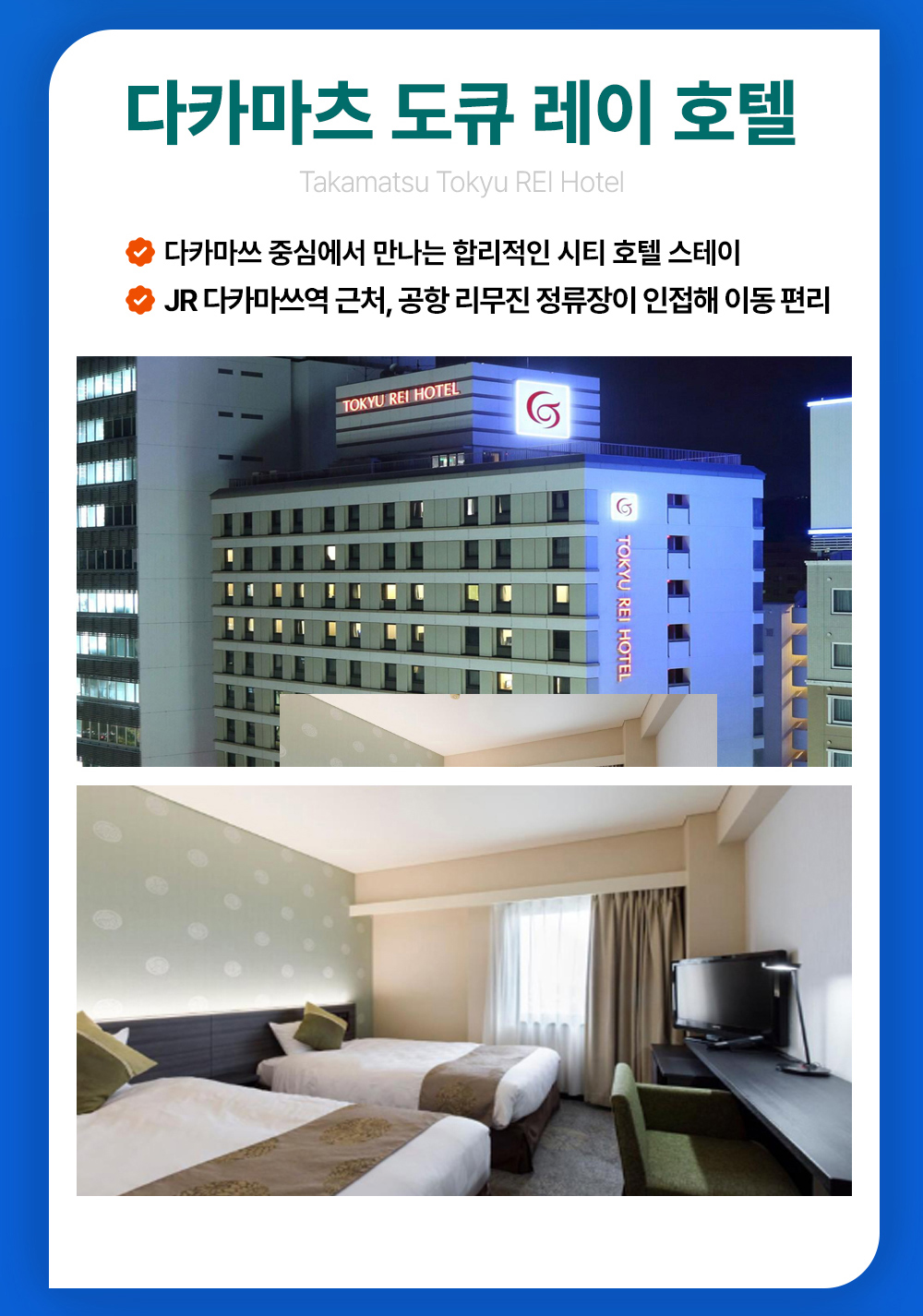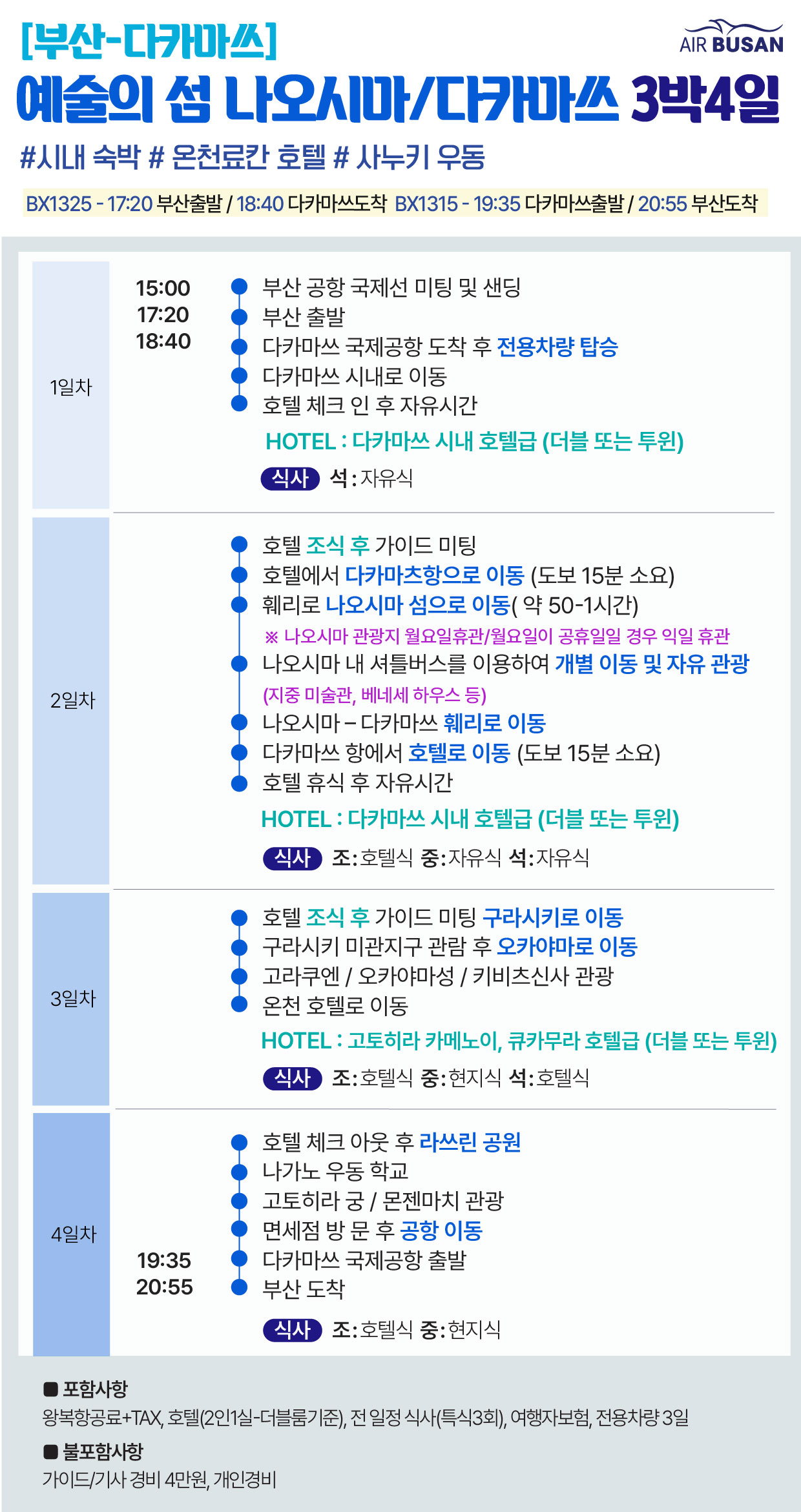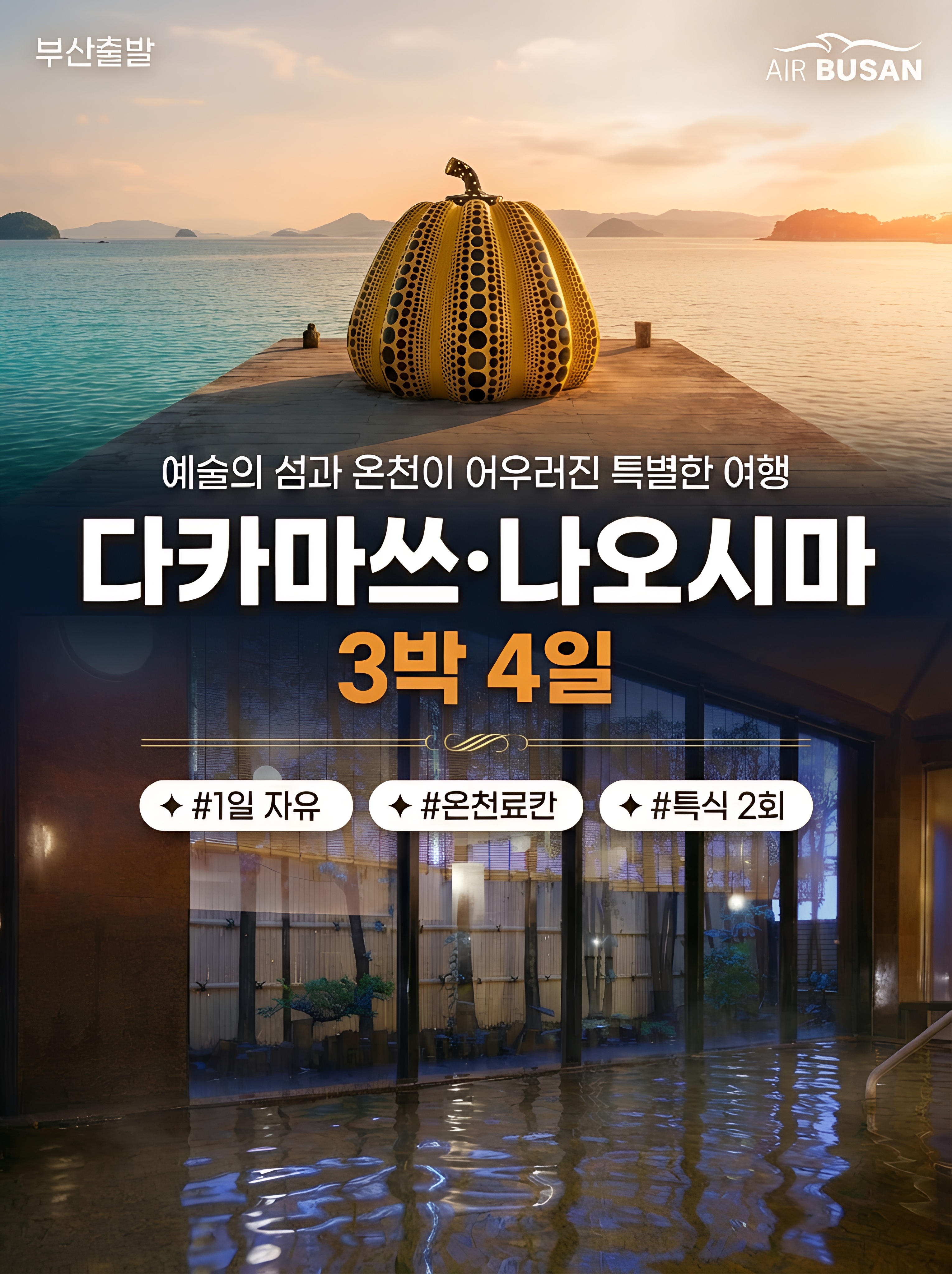 💙 다카마쓰 체험형 프리미엄 패키지 💙 ✈️ 부산 출발 3박 4일 🟣 상품 핵심 포인트 ✅ 부산 ↔ 다카마쓰 직항 이용 (약 80분) ✅ 나오시마 자유관광 + 페리 왕복 포함 ✅ 사누키 우동학교 체험 (직접 만드는 체험) ✅ 다카마쓰 시내호텔 2박 + 온천호텔 1박 구성 ✅ 온천호텔 숙박으로 힐링 여행 완성 ✅ 특식 2회 포함 (현지 미식 체험) ✅ 전용차량 이동으로 편안한 일정 ✅ 관광 + 자유시간 균형 잡힌 구성 👍 이런 분들께 추천드려요 ✔ 단순 관광보다 체험 중심 여행을 원하는 분 ✔ 나오시마 + 근교까지 알차게 여행하고 싶은 분 ✔ 온천호텔에서 여유롭게 힐링하고 싶은 분 ✔ 먹거리·체험·관광을 모두 즐기고 싶은 분 ✔ 부모님과 함께하는 프리미엄 효도여행을 찾는 분 ✔ 친구·연인과 함께 특별한 여행을 원하는 분 ❌ 불포함사항 기사/가이드 경비 40,000원/인(성인/아동 요금 동일) 나오시마 관광 시 중식 1일차, 2일차 석식 나오시마 섬 내 교통비 및 미술관 입장료 기타 개인경비 📍 꼭 확인해주세요 🏨 객실 이용 안내 🛏️ 시내 호텔 싱글 이용 시 → 1박 70,000원 / 2박 140,000원 ♨️ 온천호텔 싱글 이용 → 별도 문의 🏨 객실 타입 안내 → 트윈 또는 더블 랜덤 배정 (지정 불가) 👥 3인 이용 시 → 시내호텔: 트리플룸 불가 → 트윈(또는 더블) 1실 + 싱글 1실 이용 🛏️ 온천호텔 → 다다미 객실로 3~4인 1실 이용 가능 ⚠️ 유의사항 본 상품은 단체 패키지 상품입니다 개별 일정 진행 불가 타 국적자 및 현지 조인 예약 불가 ✨ 한 줄 포인트 👉 “체험·관광·온천까지 모두 담은 프리미엄 다카마쓰 여행” 🔖 해시태그 #다카마쓰부산직항 #나오시마자유관광 #사누키우동 #왕복페리포함 #온천호텔숙박