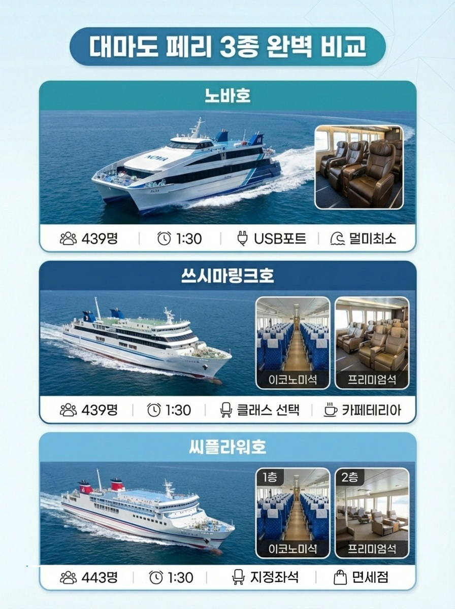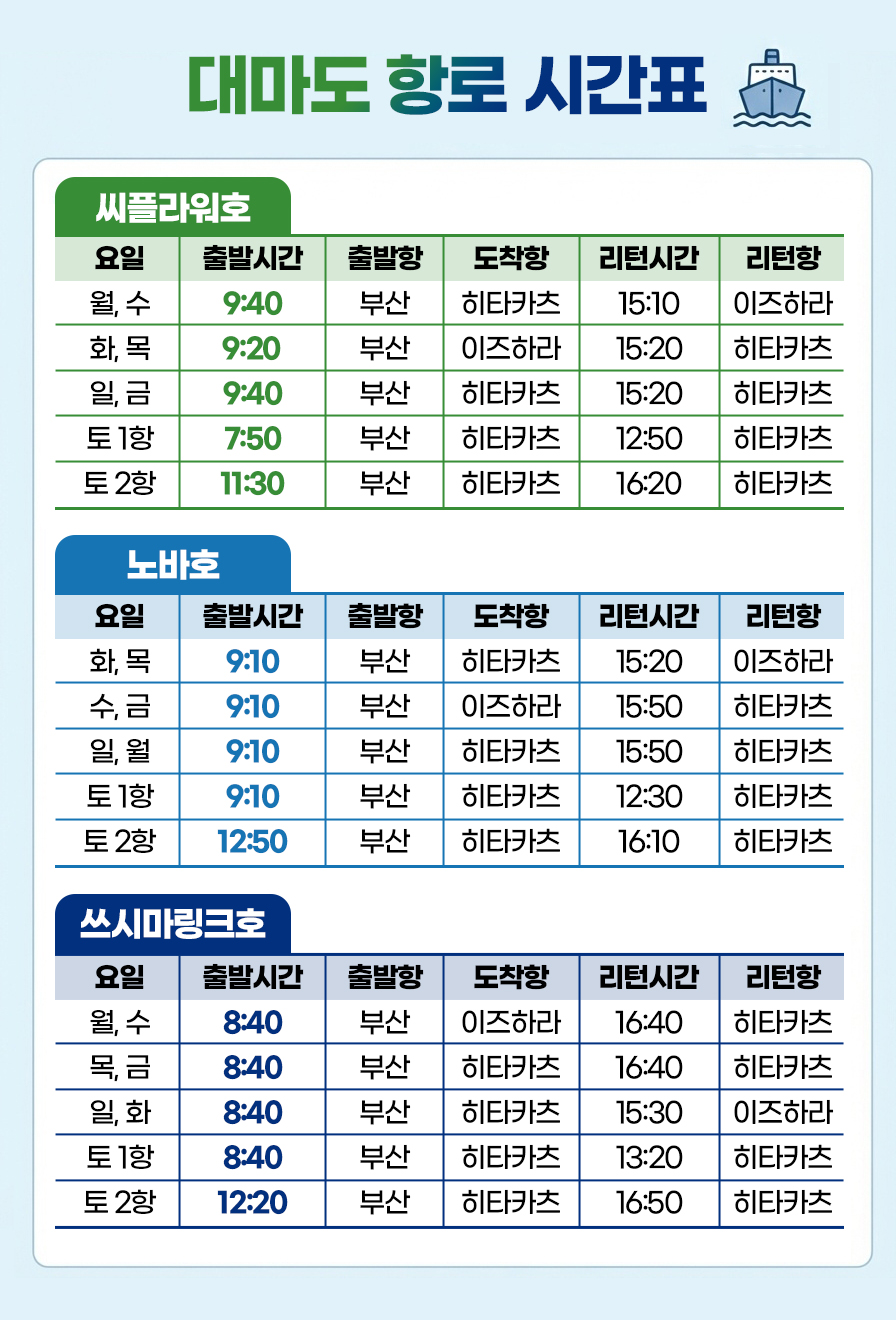 • ■ 출발 요일 및 선사 따라 출발 시간 및 도착 항구가 상이하므로 예약 후 출발 시간 재확인 해주셔야합니다.