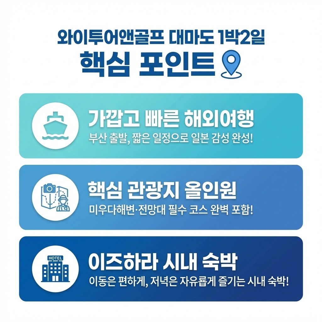 비행기 탈 필요 없이 배 타고 슝— 일본 도착! 주말에 부담 없이 가볍게 떠나 바다 보고, 먹고, 쉬고, 쇼핑까지. 짧지만 확실한 해외여행으로 리프레시 🌿 ‼️이런 분들께‼️ 👉🏻 대마도 패키지, 강력하게 추천 드립니다 ! 💜이동 동선이 길지 않은 여행을 선호하시는 분 💜가성비 좋은 일본여행을 찾고 계신 분 💜부모님과 함께 무리 없는 여행을 계획 중인 분 💜짧고 굵게 일본 다녀오고 싶은 분 💜쇼핑+관광 모두 하고싶으신 분 💜깔끔하고 안정적인 호텔 숙박을 중요하게 생각하시는 분 ✨ CHECK POINT ! 🌀부산항 ↔ 대마도 왕복 선박 이용 (씨플라워 · 노바 · 쓰시마링크 중 배정) 🌀약 1시간대 이동으로 부담 없이 해외여행 🌀이즈하라 시내 토요코인 호텔 숙박 (조식 포함) 🌀대마도를 대표하는 자연 관광 코스 (미우다 해수욕장 · 슈시강 · 만관교 · 에보시타케 전망대) 🌀한국인 가이드 동행 + 전용 차량 이동 🌀여행자보험 포함 🌀합리적인 1박2일 일정 📢 안내사항 ※ 가이드/기사 비용 1인 20,000원과 출국세 1,000엔, 개인경비는 불포함사항입니다. ※ 호텔 싱글차지 추가비용 1인 30,000원 발생합니다. #대마도 #부산에서대마도 #대마도여행 #일본여행 #대마도1박2일 #짧은일본여행 #가성비일본여행 #일본1박2일 #대마도패키지 #일본패키지여행 #선박여행 #토요코인호텔 #이즈하라 #히타카츠
