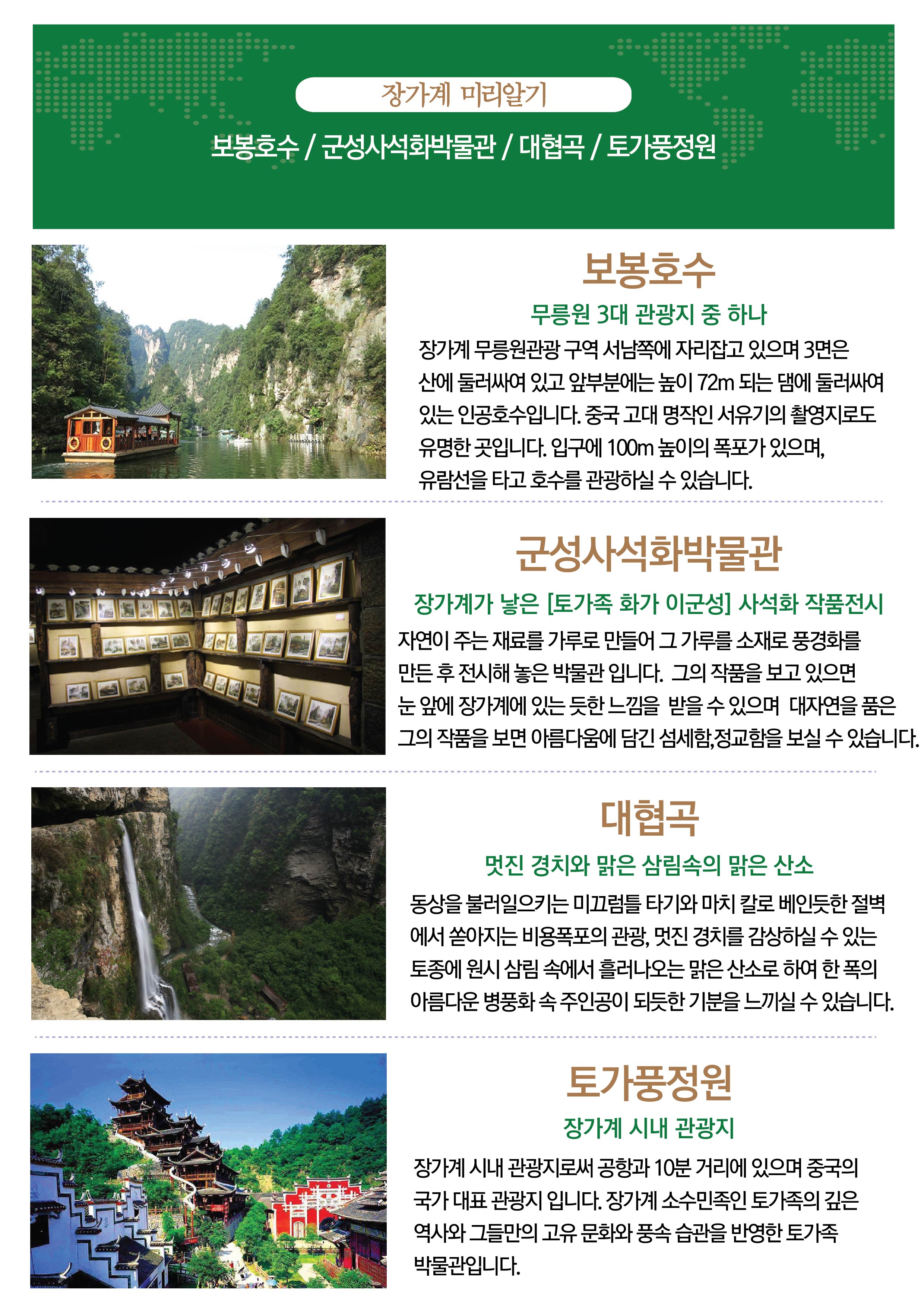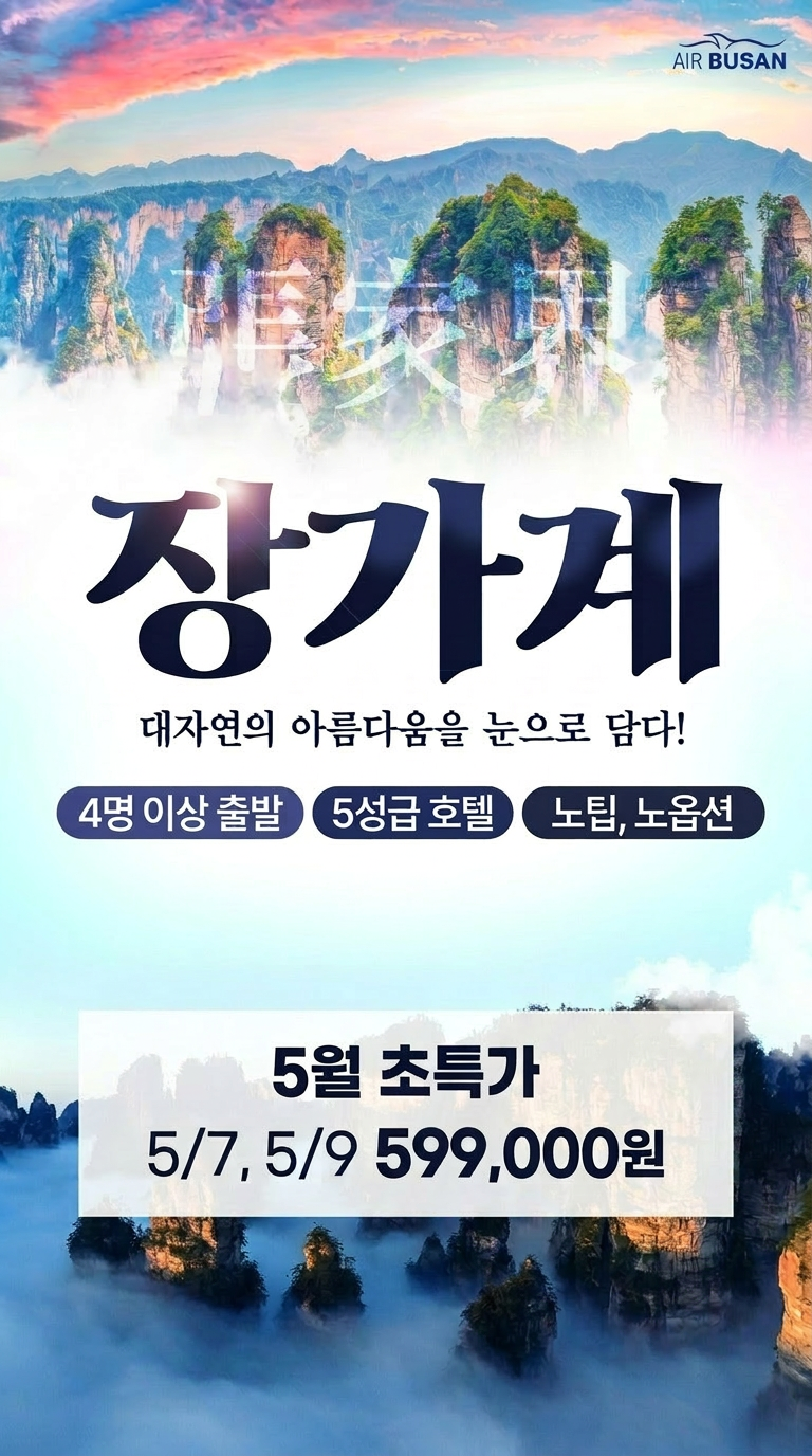 🏆 담당자 강력 추천 1순위 상품 ✔ 핵심 관광 + 프리미엄 특전 + 업그레이드 식사까지 👉 “이 가격에 이 구성, 다시 없습니다!” 🎁 와이투어 ONLY! 압도적 혜택 💥 총 $400 이상 포함된 특전 패키지 💥 ✔ 가이드/기사 경비 포함 (추가비용 NO!) ✔ 세계 최장 460m 유리다리 + 대협곡 풀코스 ✔ 장가계 대표 공연 ‘천고정쇼’ 포함 ✔ 천문산 핵심 ALL-IN (유리잔도 + 귀곡잔도 + 정상코스) ✔ 황룡동굴 VIP 코스 입장 ✔ 여행 피로 싹~ 발+전신 마사지 1회 ✔ 보봉호수 VIP 유람선 탑승 ✔ 핫플 72기루 내부관광 + 탕후루 제공 ✔ 감성 한 잔 ☕ 커피 or 밀크티 제공 ✔ 객실당 과일바구니 증정 🍎 👉 옵션? 추가비용? 없습니다. 전부 포함입니다. 🍽️ “식사까지 다르다” 프리미엄 구성 🔥 여행 만족도 = 식사에서 결정됩니다 🔥 ✔ 진짜 보양식! 누룽지 닭백숙 ✔ 깊은 풍미 버섯전골 ✔ 건강한 산채 비빔밥 ✔ 한국식 보쌈 정식 ✔ 속까지 시원한 동태탕 ✔ 한국인의 소울푸드 삼겹살 특식 👉 “어디서 먹느냐가 아니라, 무엇을 먹느냐가 다릅니다.”