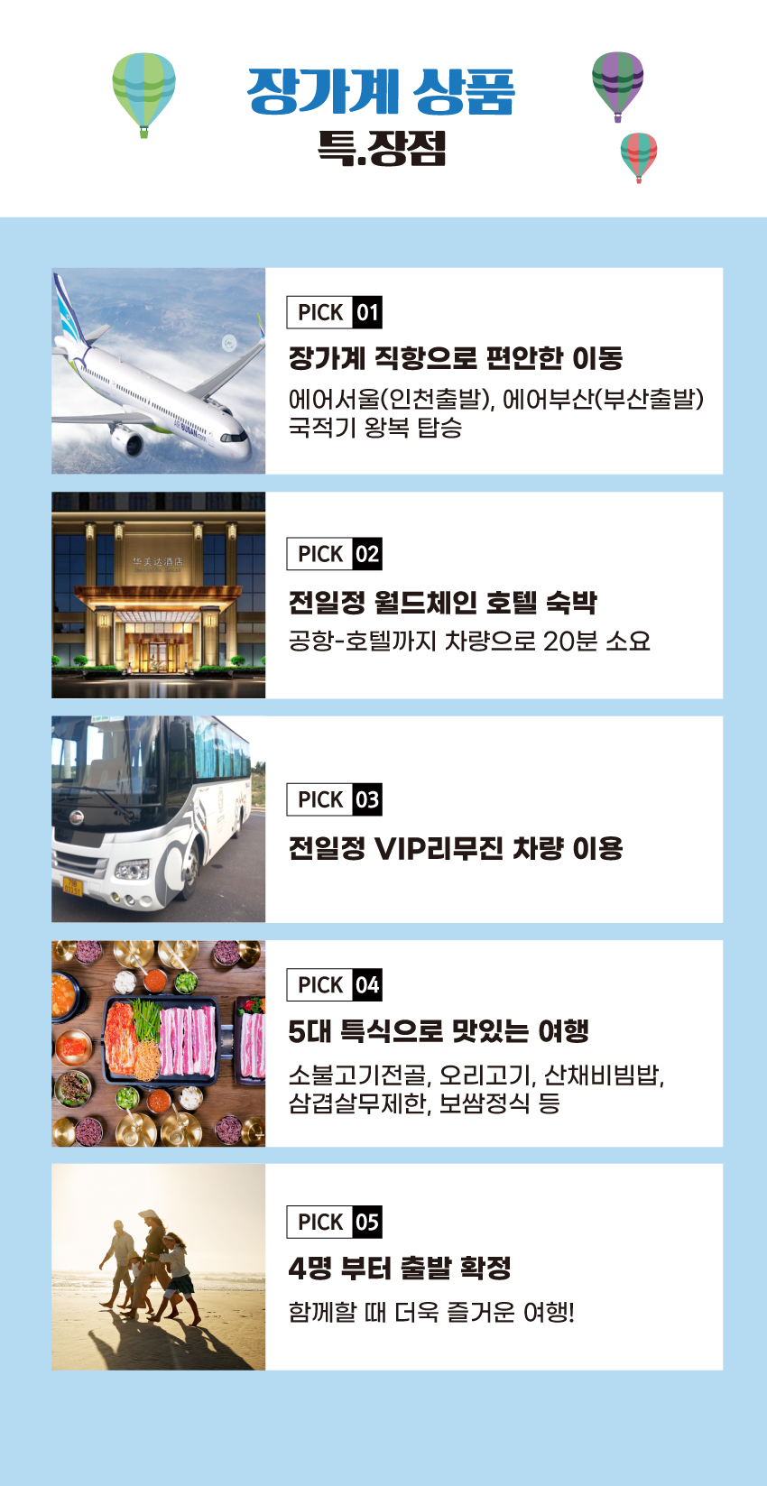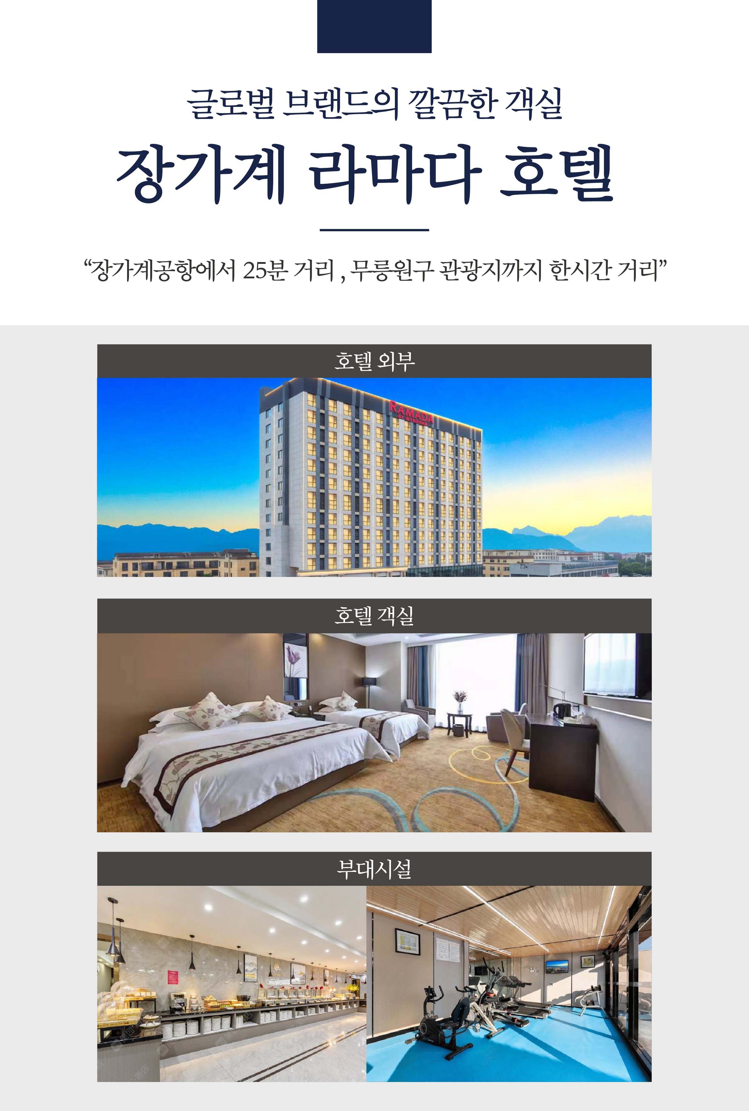 📌 와이투어&SK스토아와 함께 떠나는 한 폭의 그림 같은 성수기 장가계 여행 - 장가계 여행의 최적의 성수기 시즌 3월 ~ 6월 출발기간 포함 - 소중한 여행의 시간, 장가계 공항 왕복 직항으로 떠나는 효율적이고 편안한 이동 동선 제공 - 단순한 숙박이 아닌, 하루의 여정을 더욱 기분 좋게 마무리해줄 전 일정 월드체인 호텔 숙박 - 약 $150 상당 혜택과 함께 떠나는 꽉 찬 장가계 일정 제공 📌 이동없는 전 일정 깔끔하고 쾌적한 월드체인 호텔 숙박 제공 1) 라마다 바이 윈덤 장가계 호텔 (또는 동급) -공항 차량 약 20분 소요, 천문산 케이블카 탑승장 차량 10분 이내 등 주요 관광지 접근성 우수 📌 장가계의 아름다운 낮과 밤 ! $150 상당 일정 및 야경 일정 완벽 포함 🏆 편안함이 다른 장가계, 웅장하고 광할한 장가계의 비경을 쾌적하게 즐기는 6대 탑승 일정 포함 - 웅장한 기암괴석과 나무들이 어우러진 신선의 정원, 장가계의 랜드마크 ‘천문산&천문동’ (케이블카 및 에스컬레이터 탑승) - 유명 영화의 배경지, 자연의 신비를 간직하고 있는 '천자산' (케이블카 편도 탑승) - 절벽과 구름이 맞닿는 그곳, 천하제일교를 볼 수 있는 '원가계' (백룡엘리베이터 편도 VIP 탑승) ($20 상당) - 산속에 숨겨진 청명한 호수, 장가계의 숨은 낙원이라고도 불리는 '보봉호수' (VIP셔틀 및 유람선 포함) ($50 상당) - 배를 타고 만나는 화려한 조명 속 종유석, 석순 ‘황룡동굴’ VIP코스 (유람선탑승) ($50 상당) - 끝없이 펼쳐진 기암괴석과, 그림 같은 자연 숲길 '십리화랑' (모노레일 왕복 포함) - 전통 문화를 그대로 간직한 복합 문화 공간 '72기루 내부관광 (내부 야시장+공연관람) ($30 상당) - 웅장한 산수를 배경으로 하여 산책을 하며, 원시림의 청량한 공기를 즐길 수 있는 '금편계곡' - 창밖으로 이어지는 깎아지른 협곡의 스케일 '백장협' (차창) - 장가계의 역사를 한눈에 담을 수 있는 '군성사석화박물관' 📌 여행의 빠질 수 없는 재미, 다양한 현지 특식 포함 현지 전 일정 특식 제공 - 호텔식 석식, 소불고기전골, 오리고기, 산채비빔밥, 무제한 삼겹살, 보쌈정식 등 📌 끝나지 않은 혜택 ! sk스토아 고객님께 드리는 예약자 혜택 - 전 일정 기사/가이드 경비 포함 - 장가계 전통차 제공 (1인/1통) 📌 함께할 때 더욱 즐거운 여행 ! 4명 이상 예약시 출발 확정 (성인기준)