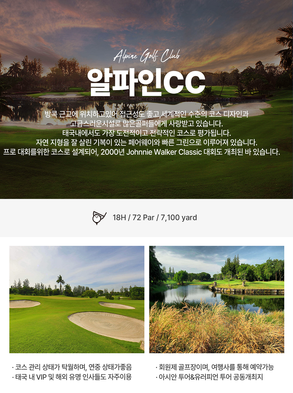 📍알파인만의 특별한 포인트 1️⃣ 태국 최초 논(패디필드) 그린 🌾 파3 홀 중 하나를 논(논밭)이 둘러싸고 있는 태국 유일무이한 홀 존재 — 시각적 임팩트 최강 2️⃣ 산악 지형 코스 🏔️ 태국 대부분의 평지 골프장과 달리, 한국 골프장처럼 오르막·내리막 경사가 많아 전략적 플레이 필수 3️⃣ 국제 기준 그린 🟢 스팀프미터 최소 10 이상 유지 — 빠르고 넓은 그린, 생각하고 공략해야 스코어 기대 가능 4️⃣ 워터 해저드 다수 💧 코스 곳곳 연못과 워터 해저드 → 긴장감과 스릴 보장, 정교한 샷 요구 5️⃣ 코스 수첩 제공 📋 라운드 전 각 홀 정보가 담긴 수첩 제공 → 전략적 플레이 가능, 초보자도 코스 이해 쉬움