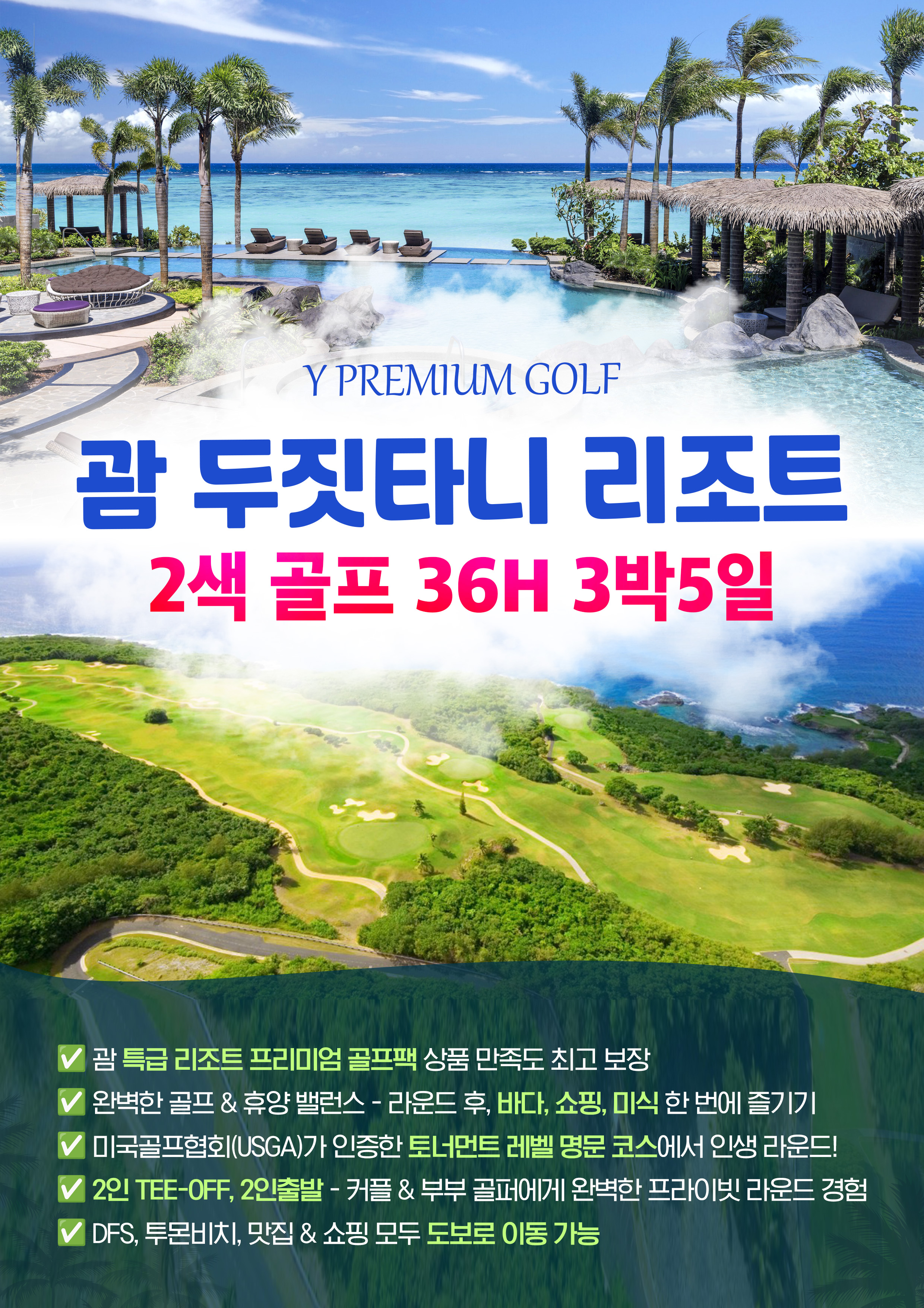 💎Y 시그니처 골프 패키지 ✅ 오직 Y에서만, 괌 시그니쳐 골프팩 상품 만족도 최고 보장💁‍♂️ ✅ 평균기온 27℃, 시원한 바람과 함께 언제나 쾌적한 라운드 환경🌴 ✅ 미국골프협회(USGA)가 인증한 토너먼트 레벨 명문 코스에서 인생 라운드!⛳ ✅ 2인 TEE-OFF, 2인출발 - 커플 & 부부 골퍼에게 완벽한 프라이빗 라운드 경험💕 ✅ 라운드 후 즐기는 완벽한 쇼핑의 천국 괌, 수하물 23KG X2피스 무료 제공✈️