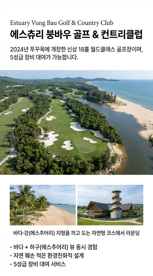 ✔ 2인출발가능 ✔ 1일자유일정 포함 ✔ 2색 골프 푸꾸옥 빈펄CC + 에스추리 붕바우CC ✔ 3박5일 일정 - 18홀X2회 ✔ 공항<->호텔 왕복 픽/드랍 차량 포함 ✔ NO가이드. NO옵션. NO쇼핑