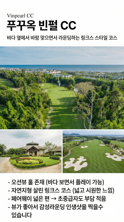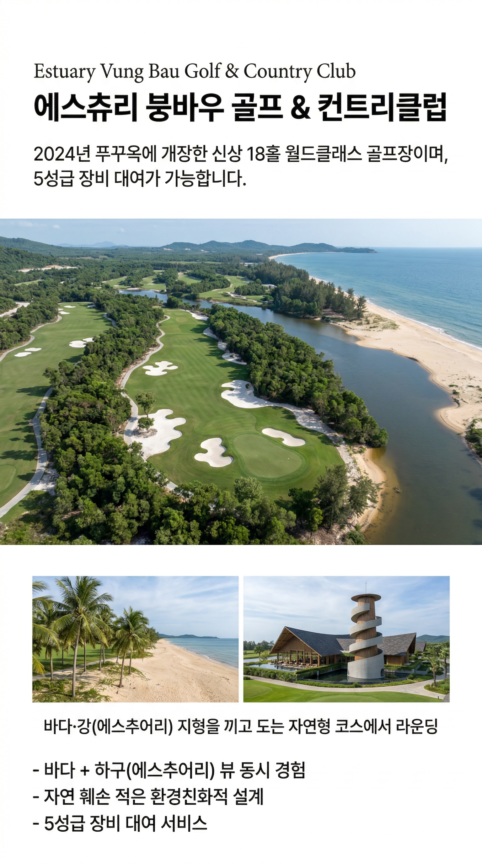 ✔ 2인출발가능 ✔ 위치최고! 호텔-골프장 차량 편도15분 ✔ 1일자유일정 포함 ✔ 2색 골프 푸꾸옥 빈펄CC + 에스추리 붕바우CC ✔ 4박6일 일정 - 18홀X3 ✔ 공항<->호텔 왕복 픽/드랍 차량 포함 ✔ NO가이드. NO옵션. NO쇼핑