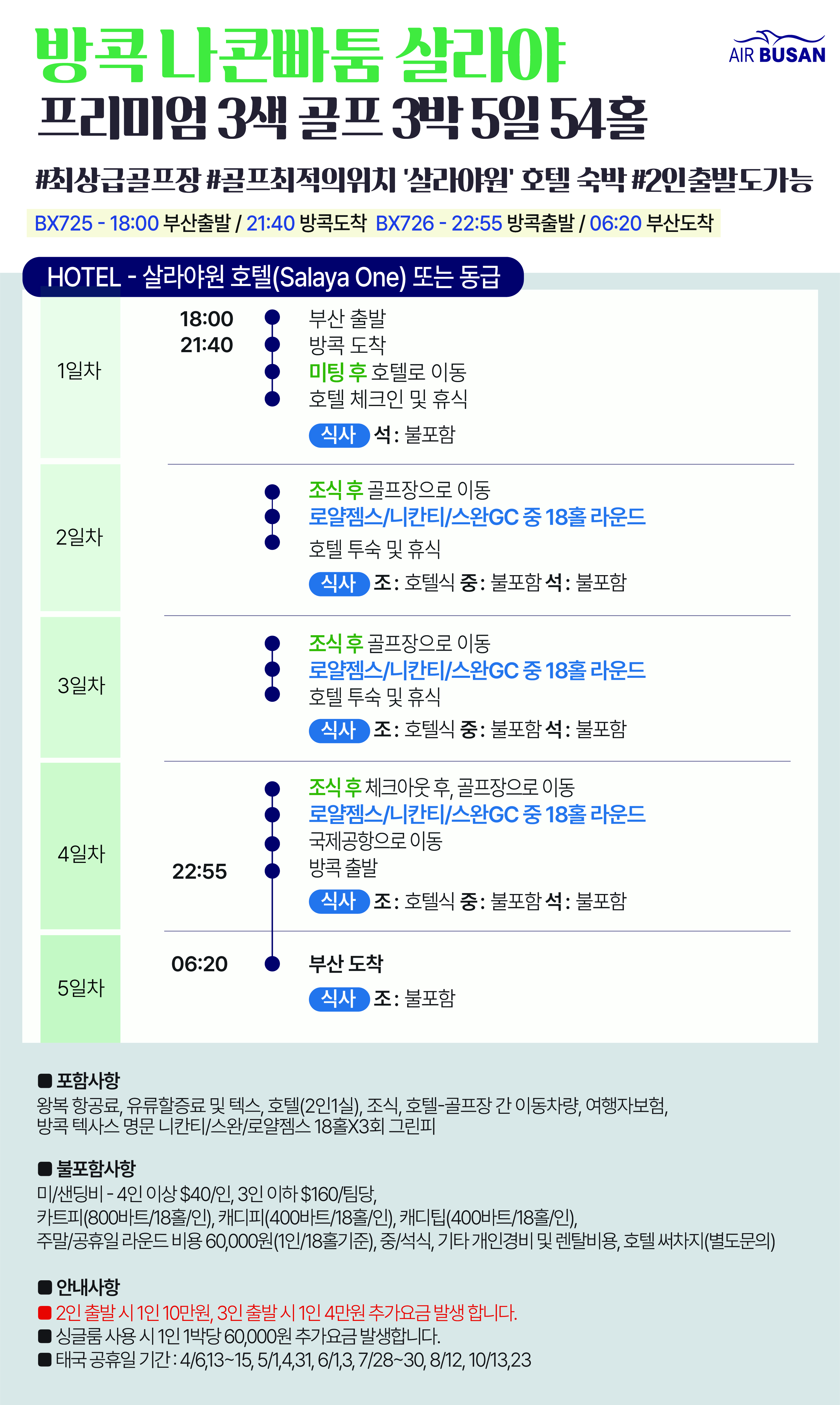 [부산출발] 💎프리미엄💎 태국 나콘파툼 살라야 3색 골프 5일⛳ #니칸티·수완·로얄젬스 #골프최적의위치살라야원호텔