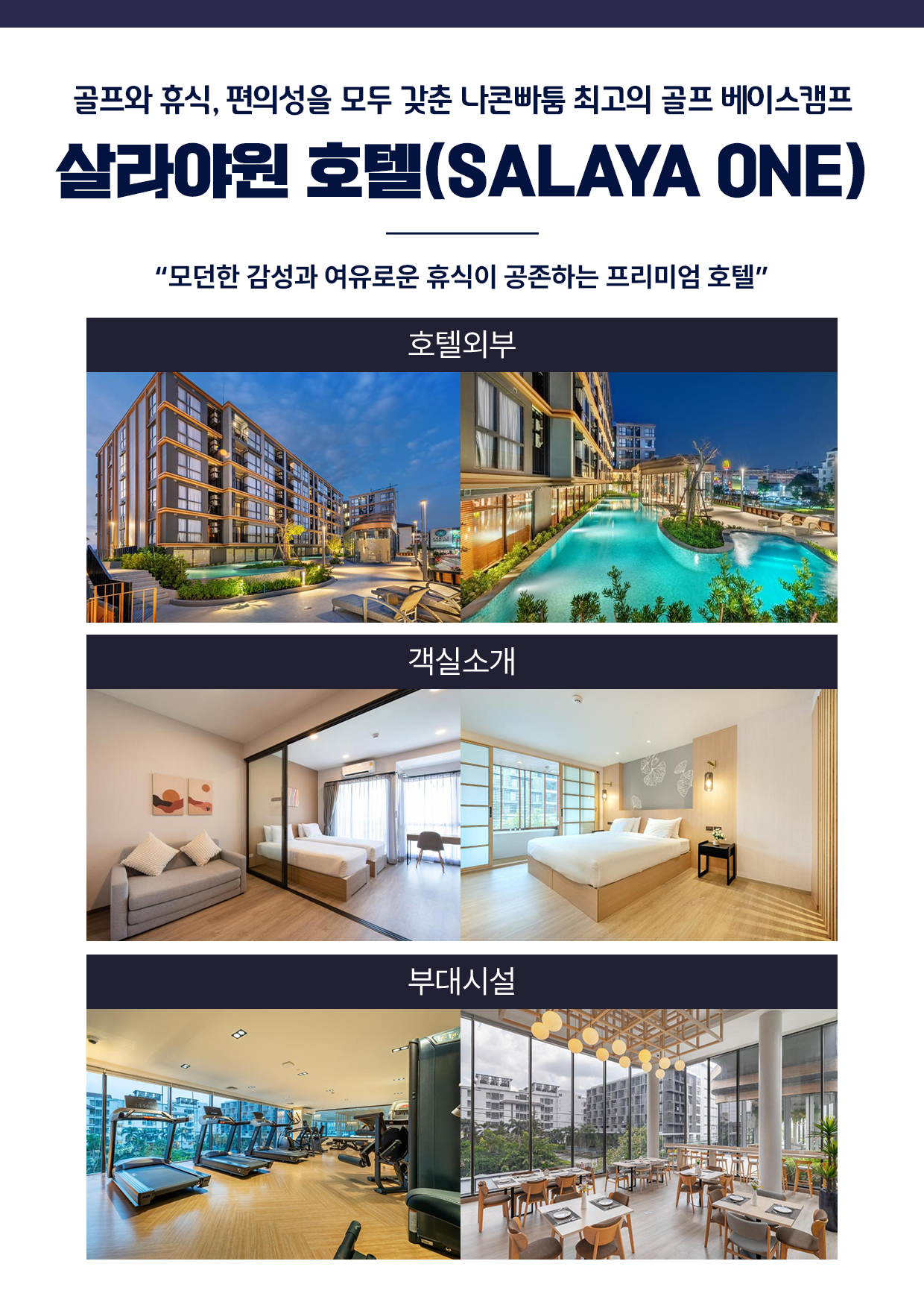 “태국 골프, 이제 길 위에서 시간을 버리지 마세요.” 태국 상급 골퍼들이 아껴둔 보물 같은 지역, **나콘파톰 살라야(Salaya)**에서 즐기는 프리미엄 3색 라운딩⛳ ✨ 핵심 컨셉 이동은 짧게🚗 / 라운딩은 길게🏌️ / 휴식은 깊게😎 방콕 시내에서 긴 이동시간을 쓰지 않고, 살라야 지역에 머물며 프리미엄 3색 골프를 효율적으로 즐기는 상품 ① 이동 스트레스 ZERO! “15분의 마법” ▪ 대부분의 방콕 패키지가 왕복 2~3시간을 도로에서 보낼 때, **살라야원(Salaya One)**은 다릅니다. ▪ 전 코스 15~20분 거리: 숙소 문 열고 나가면 금방 도착합니다. ▪ 체력 소모 최소화: 남들 차 안에서 지칠 때, 당신은 여유롭게 조식을 즐기고 라운딩에만 집중하세요. ② 태국 TOP3 명문 코스의 완벽한 조합 단순히 숫자만 채운 3색이 아닙니다. 엄선된 ''상급 코스''로만 구성했습니다. ✨ 니칸티(Nikanti) GC | 럭셔리의 정점 • 태국 최초 6-6-6홀 구성의 독특한 재미 • 올인클루시브 라운딩: 라운딩 전/후 식사는 물론 코스 내 음료와 간식까지 무제한 제공 🏆 수완(Suwan) CC | 도전적인 챔피언십 코스 • 아시안 투어 등 국제 대회 개최지 • ‘유리알 그린’으로 불리는 빠른 그린 스피드와 전략적 레이아웃 🌳 로얄젬스(Royal Gems) CC | 클래식의 정석 • 숲속에 온 듯한 아름다운 조경과 차분한 분위기 • 초보부터 싱글 골퍼까지 모두가 만족할 편안하고 깊이 있는 코스 ③ 골퍼를 위한 ‘맞춤형 베이스캠프’ 살라야원 호텔🏨 ▪ 단순한 숙소를 넘어 골퍼의 라이프 스타일을 고려 ▪ 최적의 위치: 골프장들의 중심점에 위치해 이동 효율 극대화 ▪ 쾌적한 휴식: 일반 호텔보다 넓고 깨끗한 객실에서 즐기는 깊은 숙면 ▪ 압도적 가성비: 프리미엄 코스를 즐기면서도 합리적인 비용 제안 ④ 라운딩 후 즐기는 ‘리얼 태국’ 라이프🍜 ▪ 골프만 치고 끝나는 지루한 여행은 이제 그만! ▪ 도보권 인프라: 마히돌 대학교 앞 젊음의 거리, 현지 야시장 탐방 ▪ 쇼핑 & 힐링: **센트럴 백화점(Central Salaya)**과 대형 마트 인접 ▪ 미식 여행: 태국 로컬 맛집부터 세련된 카페까지 골라 즐기는 재미