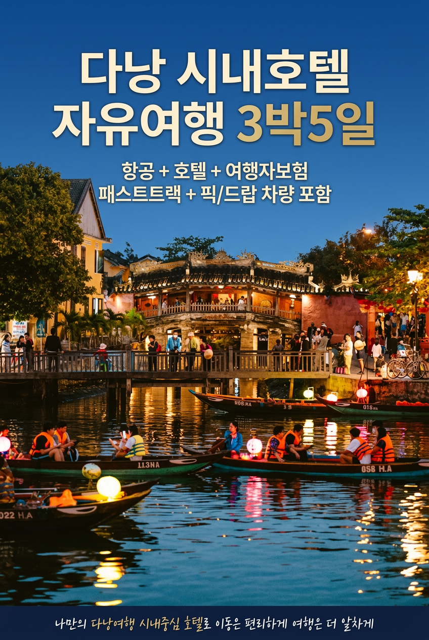 편안한 이동부터 안전한 여행까지 한 번에 해결하는 다낭 자유여행 왕복 항공권 + 패스트트랙 + 공항 픽업/샌딩 + 여행자 보험 포함으로 걱정NO! ✈️ 포함 사항 왕복 항공권 다낭 공항 패스트트랙 서비스 (빠른 입국) 공항 ↔ 호텔 왕복 전용 차량 여행자 보험 (안전한 여행 보장) 시내 호텔 숙박 (선택 가능) 🌟 상품 특징 & 장점 ✔ 대기 없는 입국 패스트트랙으로 긴 줄 없이 빠르게 공항 통과 → 여행 피로 최소화 ✔ 편안한 이동 공항 ↔ 호텔 전용 차량 제공으로 택시 걱정 NO 늦은 밤 도착도 안전하게 이동 ✔ 완전 자유 일정 패키지의 편리함 + 자유여행의 유연함 동시에 원하는 일정, 맛집, 카페 자유롭게 선택 ✔ 안전한 여행 여행자 보험 포함으로 예기치 못한 상황까지 대비 ✔ 가성비 최고 구성 꼭 필요한 요소만 담아 불필요한 비용 절감 개별 예약보다 더 합리적인 가격 🌴 이런 분들께 추천해요 패키지는 부담스럽고, 자유여행은 준비가 번거로운 분 부모님/가족과 함께 편하게 여행하고 싶은 분 첫 다낭 여행으로 이동·입국 스트레스 없이 즐기고 싶은 분 친구/커플 여행으로 가성비 + 편의성 모두 잡고 싶은 분 📍 다낭 여행 매력 포인트 아름다운 해변과 도심이 공존하는 휴양지 바나힐, 호이안, 미케비치 등 다양한 관광지 저렴하고 맛있는 현지 음식과 감성 카페 밤에는 한강 야경과 용다리 볼거리까지
