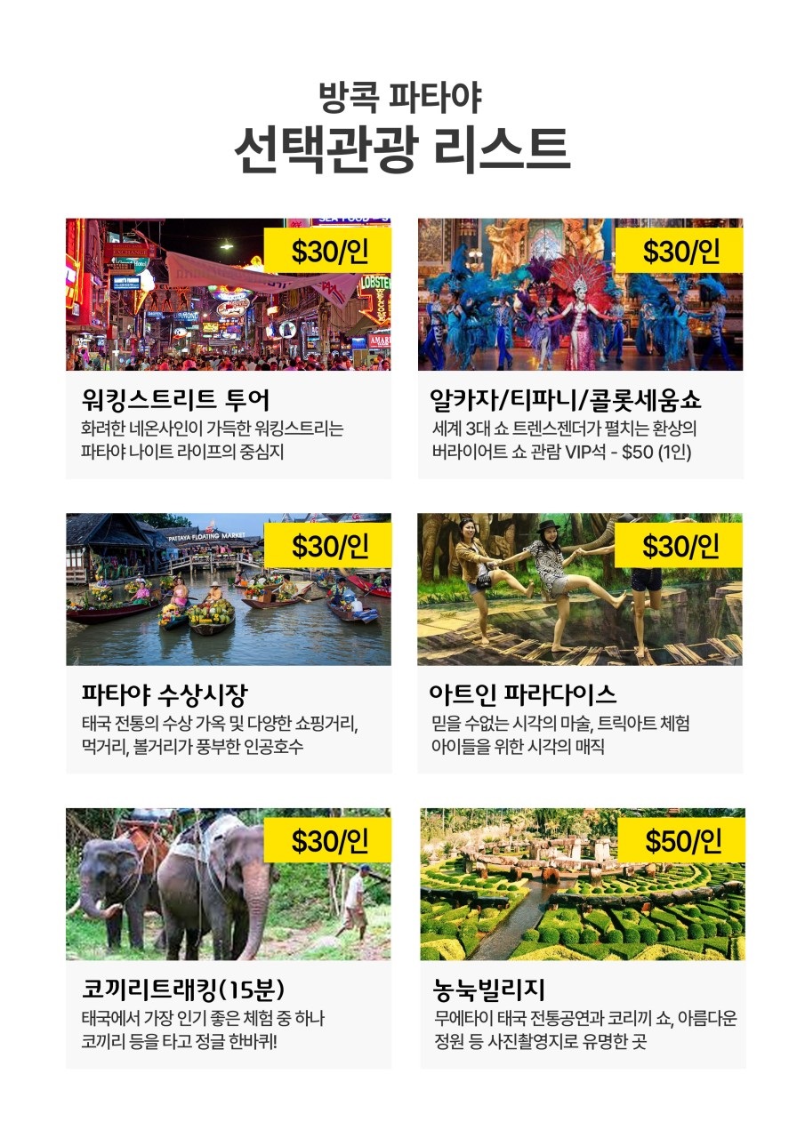 방콕+파타야 3박 5일 가족여행, 정말 최고였어요! 🌴✨ 가족들과 함께 방콕+파타야 3박 5일 노팁&노옵션 패키지로 즐거운 여행을 다녀왔어요. 처음엔 패키지라 걱정했는데, 웬걸요! 방콕에선 욧시암 크루즈로 야경 보며 맛있는 저녁 먹고, 루프탑 바에서 짜릿한 분위기도 즐겼답니다. 아이들도 어른들도 모두 신났어요! 파타야에선 아이들이 가장 기대했던 코끼리 트레킹을 했는데, 정말 특별한 경험이었어요. 엄마는 전통 마사지 2시간 받으시고 피로가 싹 풀리셨다고 하시네요. 무엇보다 노팁&노옵션이라 추가 비용 부담 없이 편안하게 즐길 수 있었던 점이 최고였어요. 짧은 일정이었지만 알차게 다 즐길 수 있어서 대만족입니다! 가족여행으로 정말 강추해요! 다음에도 또 가고 싶어요! 😊