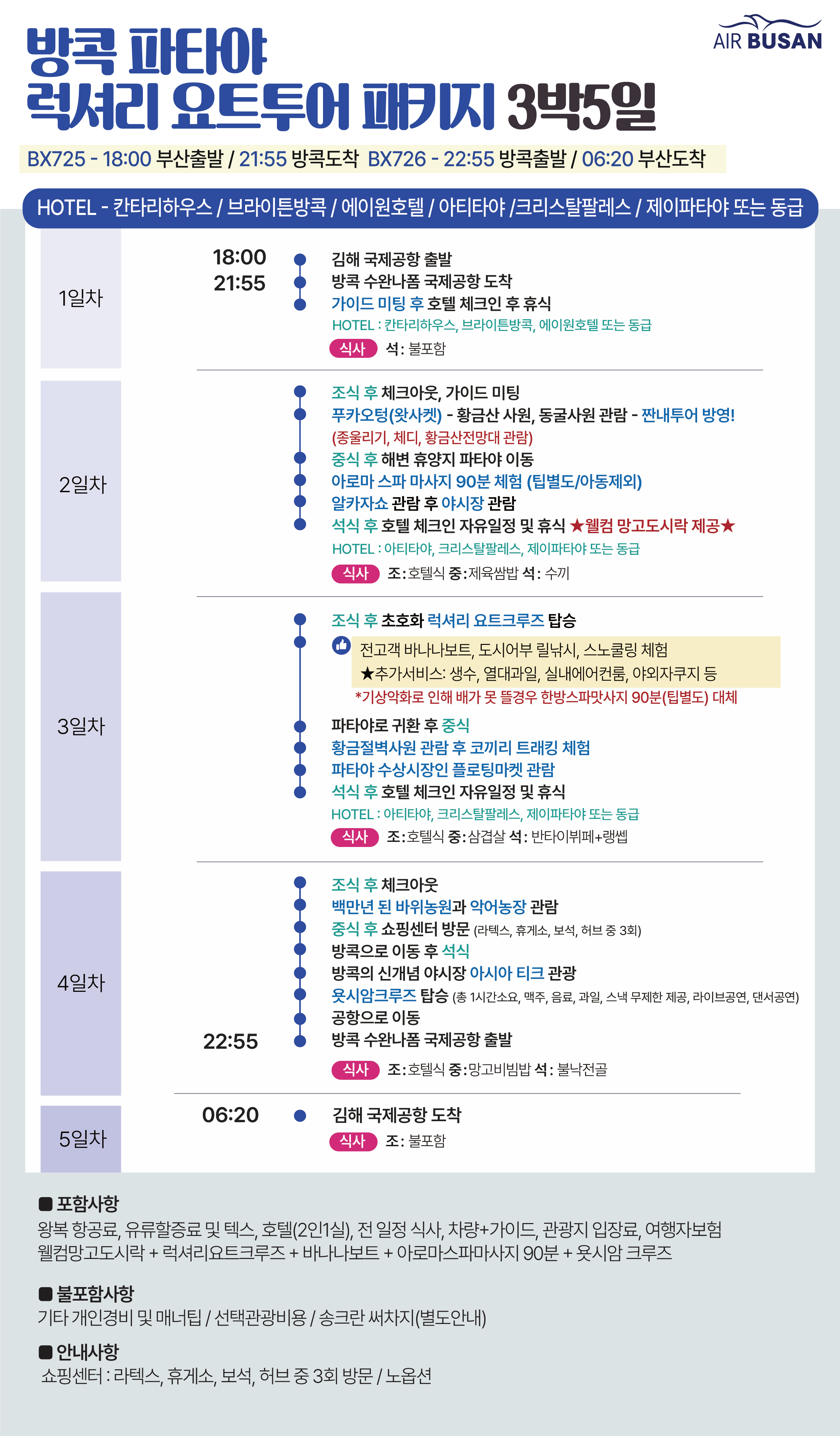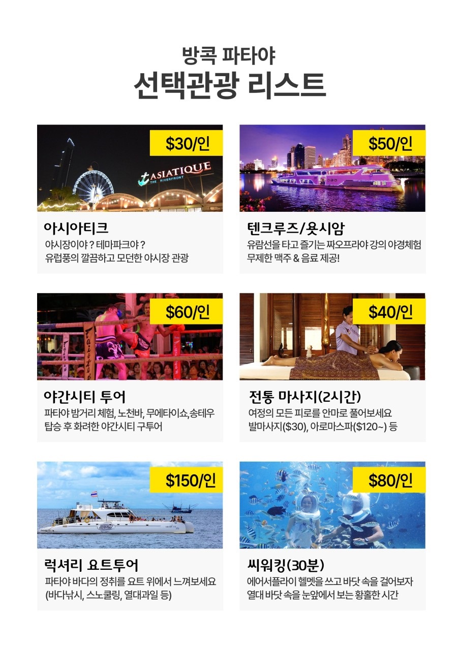 ✅ 4인이상 출발 확정 ✅ 웰컴 망고 도시락 1인 1개 제공 ✅ 아름다운 황금산 왓사켓🕌 ✅ 여행을 피로를 풀어줄 아로마스파마사지 90분 체험 ✅ 초호화 럭셔리 요트크루즈 ✅ 파타야 필수코스 알카자쇼 관람 ✅ 백만년 바위공원 + 악어농장 관람 ✅ 방콕의 신개념 야시장 아시아티크 ✅ 욧시암 크루즈 무제한 맥주+스낵+라이브 공연
