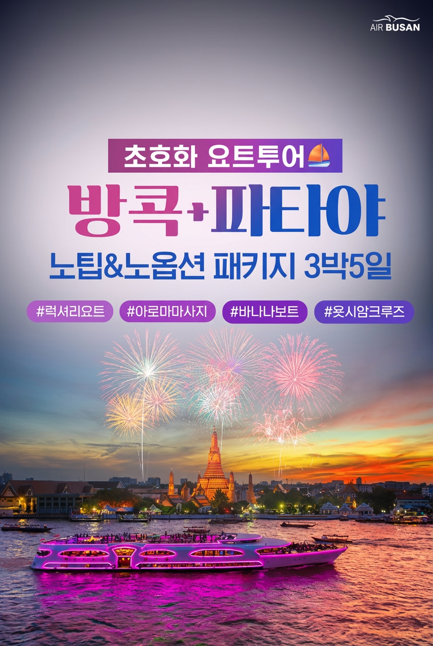 [부산출발][노팁노옵션] 방콕+파타야 💚럭셔리 요트투어 3박5일💚 (웰컴망고도시락X알카자쇼X스파마사지X욧시암크루즈)